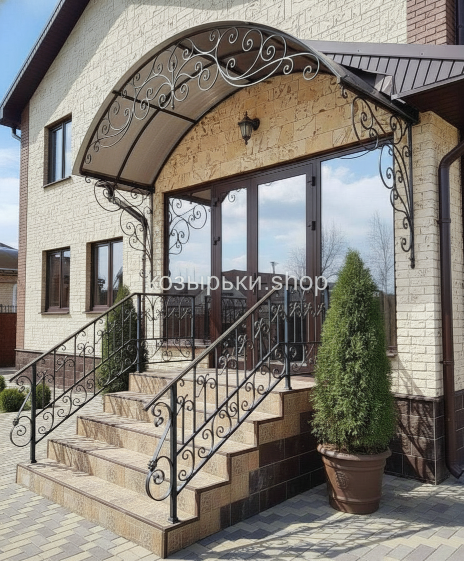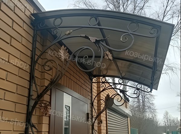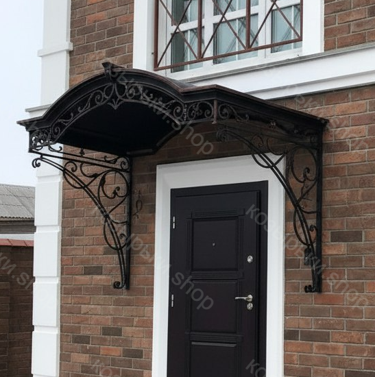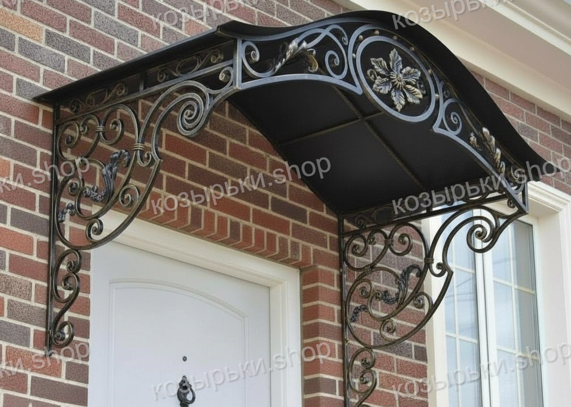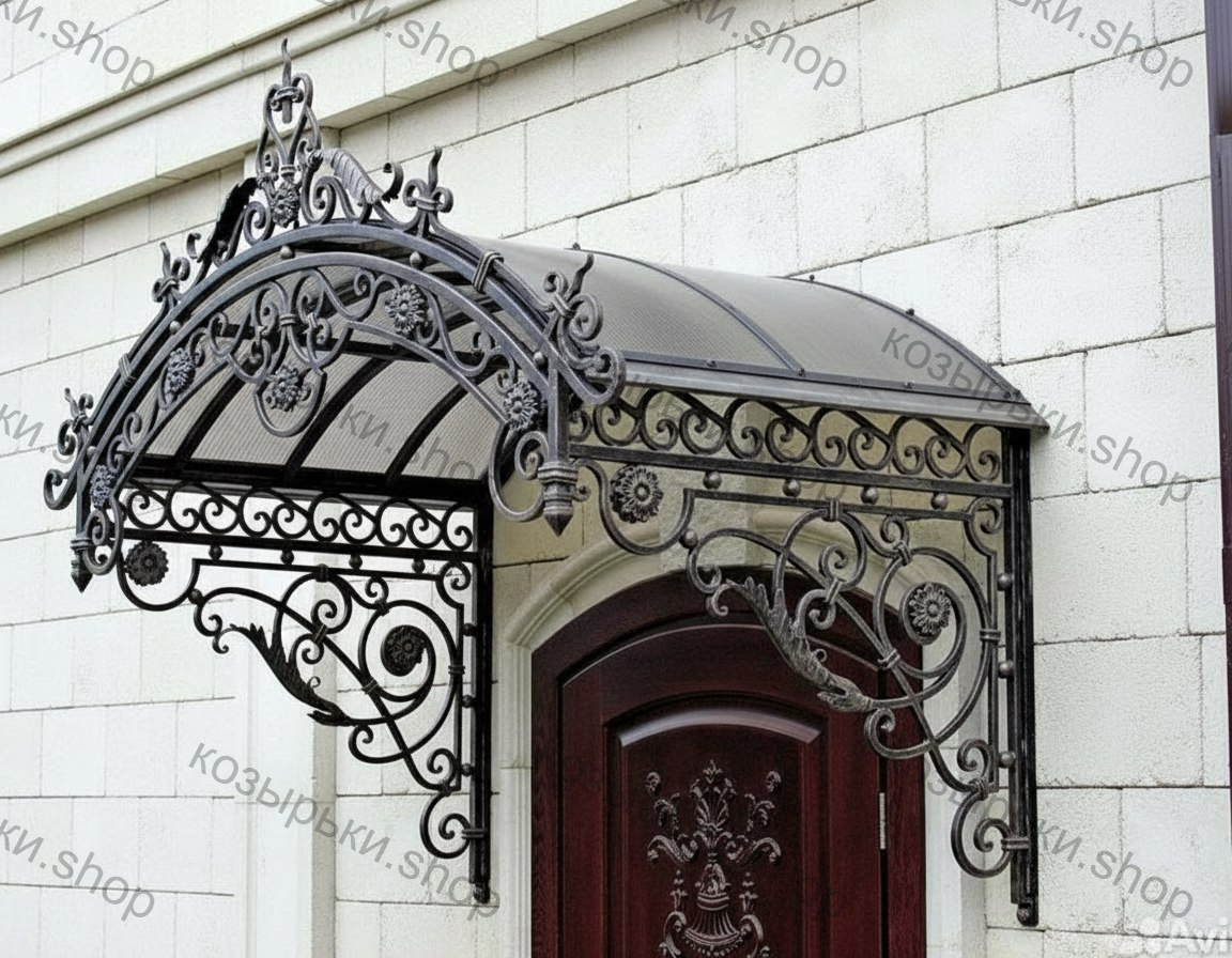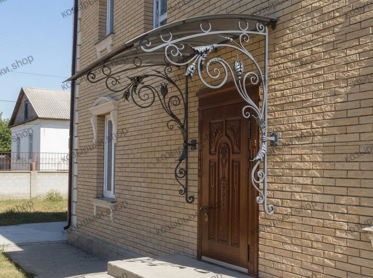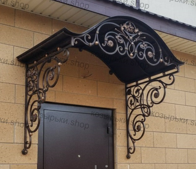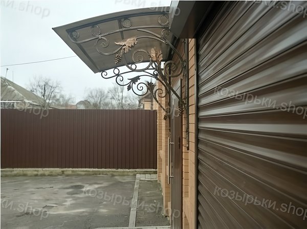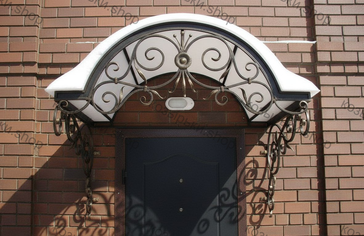 Кованый козырёк от козырьки.Shop — это не просто функциональный элемент защиты, а настоящее украшение фасада вашего дома, магазина или офиса. Почему стоит выбрать именно кованый козырёк? Козырёк надёжно укроет входную зону от дождя, снега и палящего солнца. Вы сможете спокойно открыть дверь, достать ключи или встретить гостей, не боясь непогоды. -Изделия изготавливаются из высококачественного металла с применением технологии художественной ковки. Специальная обработка (грунтовка и защитное покрытие) предотвращает коррозию и гарантирует многолетнюю службу конструкции. -Кованые узоры придают козырьку изысканный, благородный вид. Элегантные изгибы и орнаменты превращают обычный навес в произведение искусства, подчёркивая статус и индивидуальность владельца. -Козырёк гармонично сочетается с другими коваными элементами: перилами, лестницами, воротами, заборами. Он впишется в любой архитектурный стиль — от классики до модерна. -Мы предлагаем как готовые решения из каталога, так и изготовление козырька по персональному эскизу. Вы можете выбрать форму, размер и узор, которые идеально подойдут к вашему фасаду. Варианты исполнения: односкатные — лаконичные и практичные; арочные — изящные и популярные; волнообразные — с оригинальным изгибом; прямые — максимально устойчивые; шаровидные — эффектные «зонтики». Материалы на выбор: металлические листы (прочность и надёжность); монолитный или сотовый поликарбонат (лёгкость и светопропускание). Преимущества заказа у нас: профессиональный дизайн‑проект с учётом особенностей вашего здания; качественное изготовление с соблюдением всех технологических норм; аккуратная покраска в выбранный вами цвет; оперативная установка опытными мастерами. Преобразите входную зону с кованым козырьком от козырьки.Shop — сочетайте практичность с эстетикой, создавая неповторимый облик вашего здания!