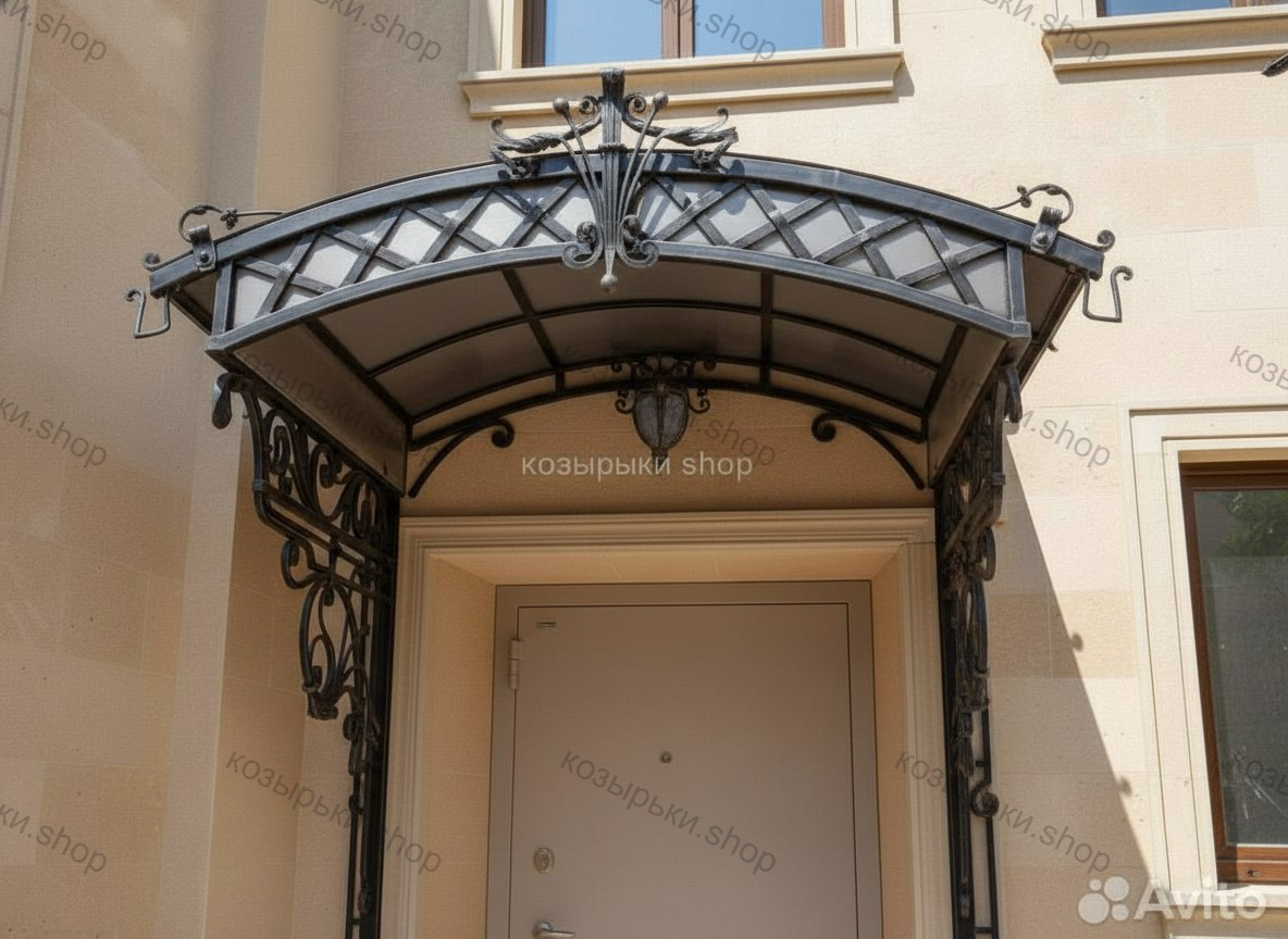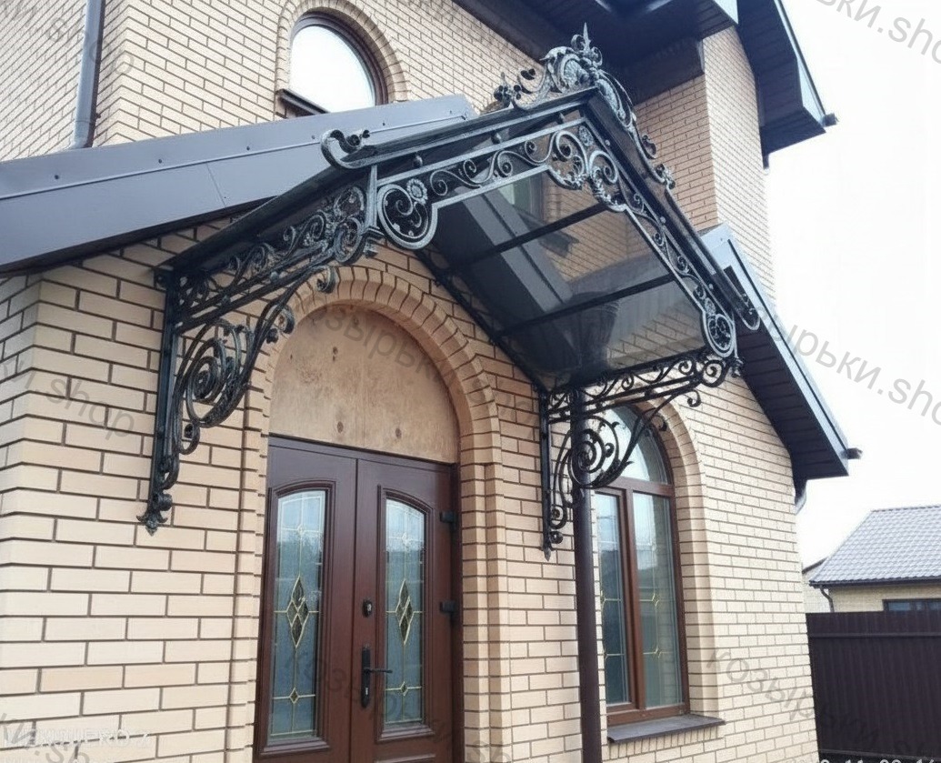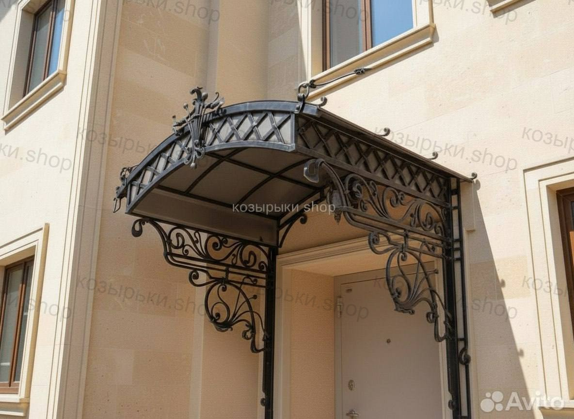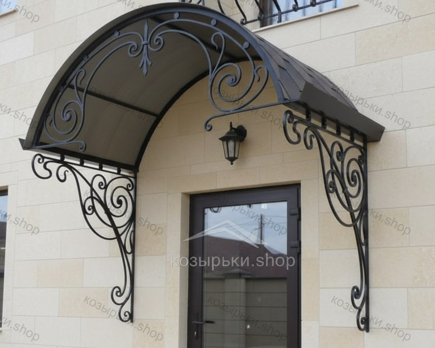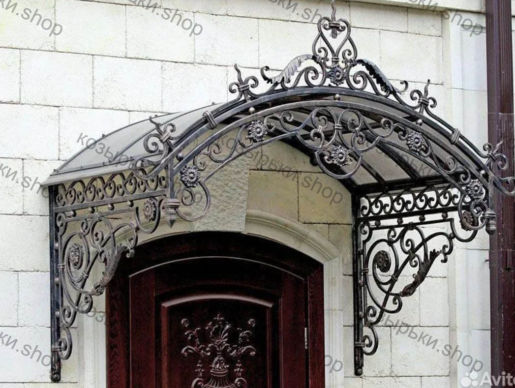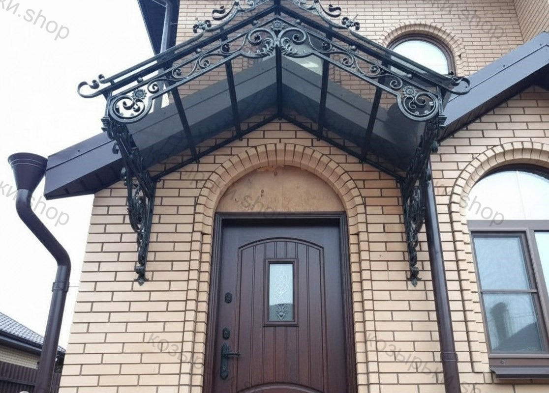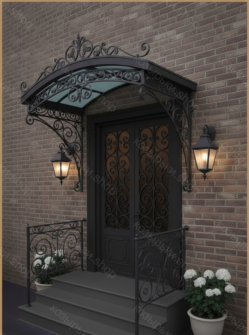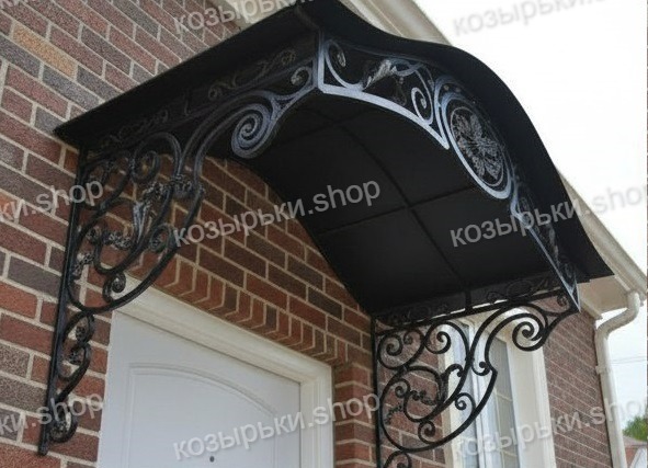 Кованый козырёк от козырьки.Shop — это не просто функциональный элемент защиты, а настоящее украшение фасада вашего дома, магазина или офиса. Почему стоит выбрать именно кованый козырёк? Козырёк надёжно укроет входную зону от дождя, снега и палящего солнца. Вы сможете спокойно открыть дверь, достать ключи или встретить гостей, не боясь непогоды. -Изделия изготавливаются из высококачественного металла с применением технологии художественной ковки. Специальная обработка (грунтовка и защитное покрытие) предотвращает коррозию и гарантирует многолетнюю службу конструкции. -Кованые узоры придают козырьку изысканный, благородный вид. Элегантные изгибы и орнаменты превращают обычный навес в произведение искусства, подчёркивая статус и индивидуальность владельца. -Козырёк гармонично сочетается с другими коваными элементами: перилами, лестницами, воротами, заборами. Он впишется в любой архитектурный стиль — от классики до модерна. -Мы предлагаем как готовые решения из каталога, так и изготовление козырька по персональному эскизу. Вы можете выбрать форму, размер и узор, которые идеально подойдут к вашему фасаду. Варианты исполнения: односкатные — лаконичные и практичные; арочные — изящные и популярные; волнообразные — с оригинальным изгибом; прямые — максимально устойчивые; шаровидные — эффектные «зонтики». Материалы на выбор: металлические листы (прочность и надёжность); монолитный или сотовый поликарбонат (лёгкость и светопропускание). Преимущества заказа у нас: профессиональный дизайн‑проект с учётом особенностей вашего здания; качественное изготовление с соблюдением всех технологических норм; аккуратная покраска в выбранный вами цвет; оперативная установка опытными мастерами. Преобразите входную зону с кованым козырьком от козырьки.Shop — сочетайте практичность с эстетикой, создавая неповторимый облик вашего здания!