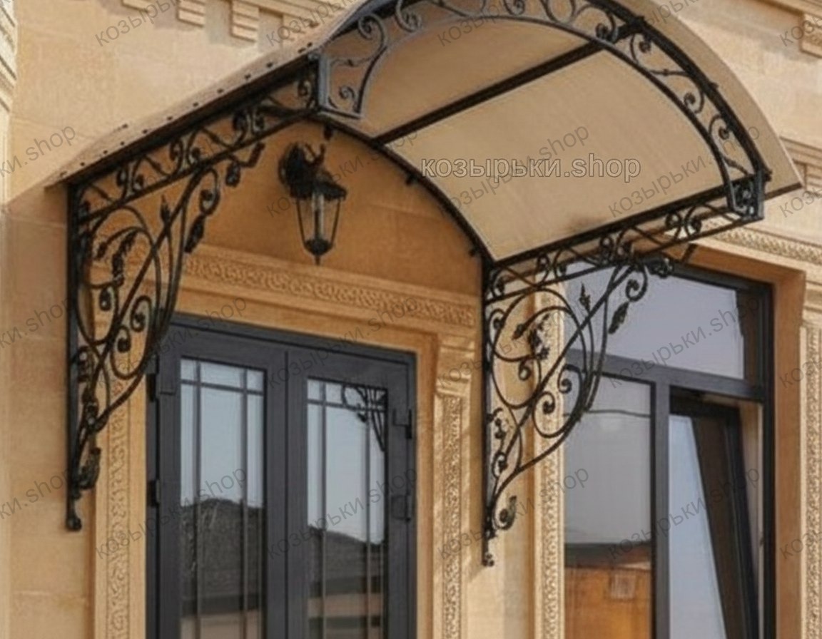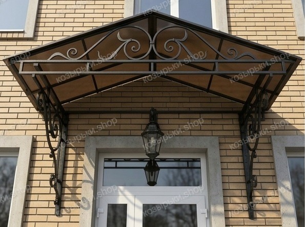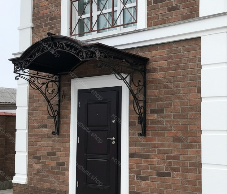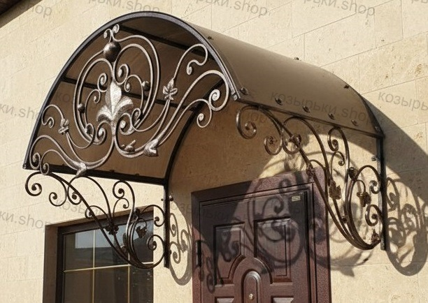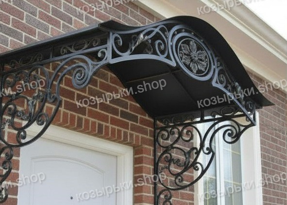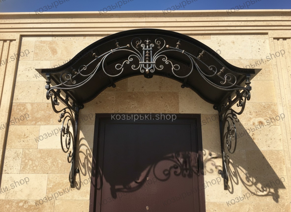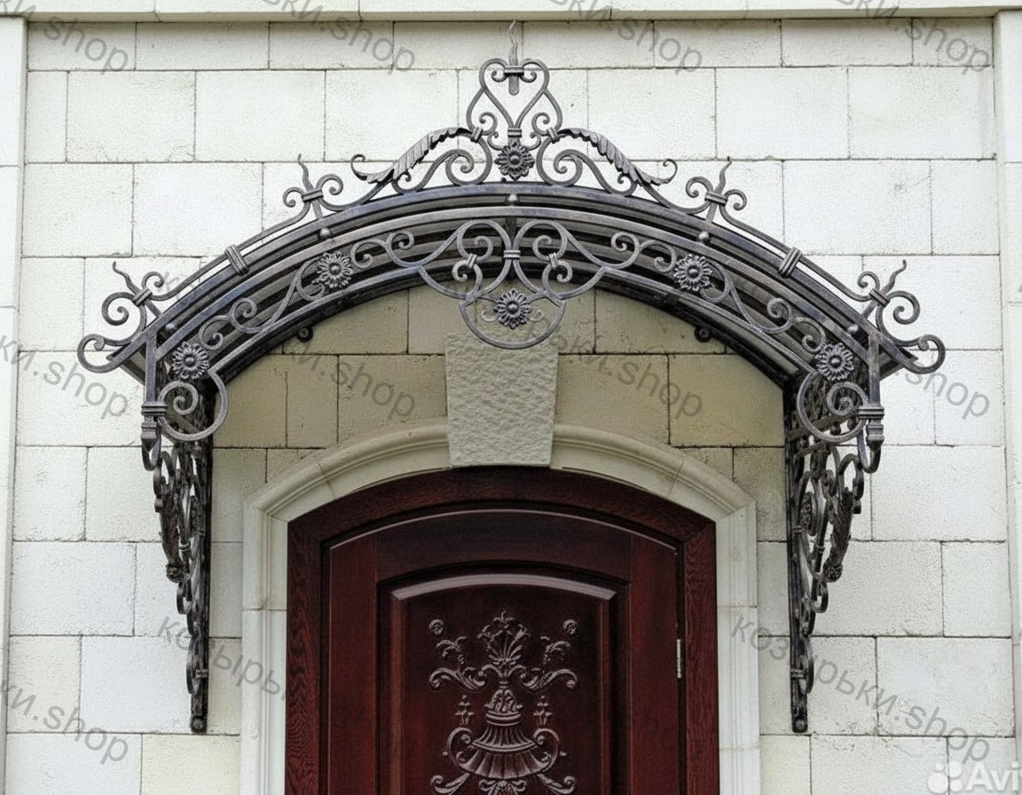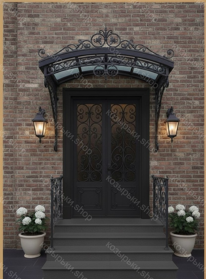 Кованый козырёк от козырьки.Shop — это не просто функциональный элемент защиты, а настоящее украшение фасада вашего дома, магазина или офиса. Почему стоит выбрать именно кованый козырёк? Козырёк надёжно укроет входную зону от дождя, снега и палящего солнца. Вы сможете спокойно открыть дверь, достать ключи или встретить гостей, не боясь непогоды. -Изделия изготавливаются из высококачественного металла с применением технологии художественной ковки. Специальная обработка (грунтовка и защитное покрытие) предотвращает коррозию и гарантирует многолетнюю службу конструкции. -Кованые узоры придают козырьку изысканный, благородный вид. Элегантные изгибы и орнаменты превращают обычный навес в произведение искусства, подчёркивая статус и индивидуальность владельца. -Козырёк гармонично сочетается с другими коваными элементами: перилами, лестницами, воротами, заборами. Он впишется в любой архитектурный стиль — от классики до модерна. -Мы предлагаем как готовые решения из каталога, так и изготовление козырька по персональному эскизу. Вы можете выбрать форму, размер и узор, которые идеально подойдут к вашему фасаду. Варианты исполнения: односкатные — лаконичные и практичные; арочные — изящные и популярные; волнообразные — с оригинальным изгибом; прямые — максимально устойчивые; шаровидные — эффектные «зонтики». Материалы на выбор: металлические листы (прочность и надёжность); монолитный или сотовый поликарбонат (лёгкость и светопропускание). Преимущества заказа у нас: профессиональный дизайн‑проект с учётом особенностей вашего здания; качественное изготовление с соблюдением всех технологических норм; аккуратная покраска в выбранный вами цвет; оперативная установка опытными мастерами. Преобразите входную зону с кованым козырьком от козырьки.Shop — сочетайте практичность с эстетикой, создавая неповторимый облик вашего здания!
