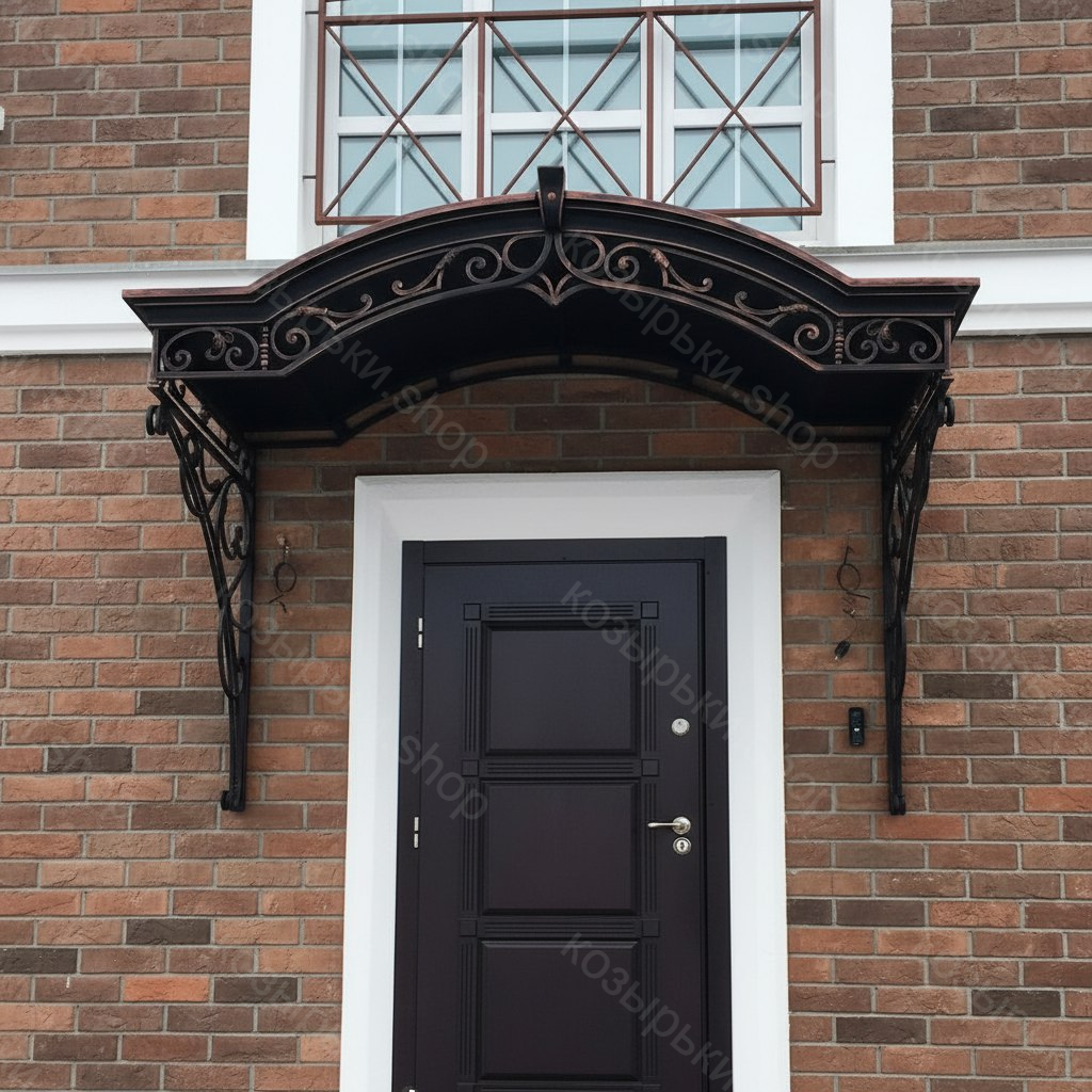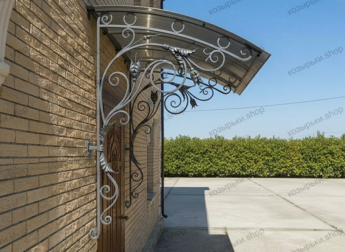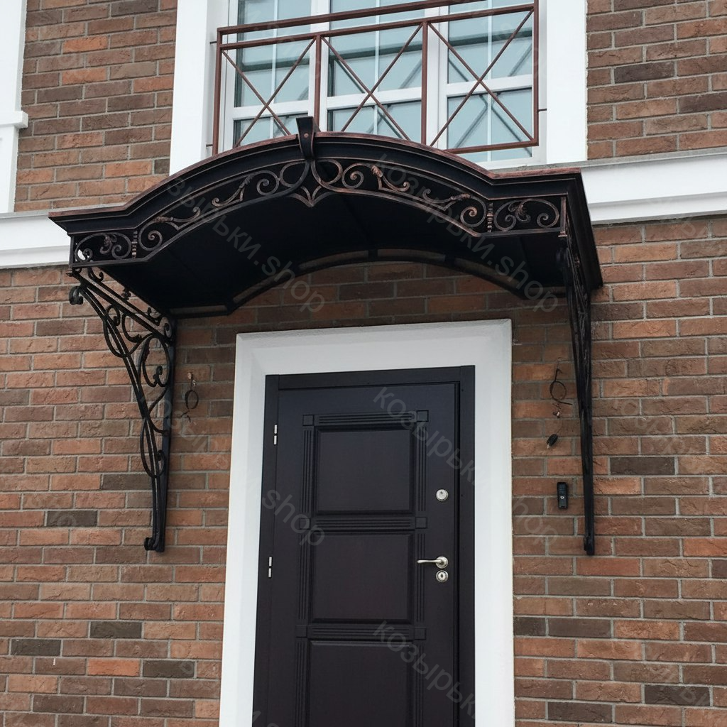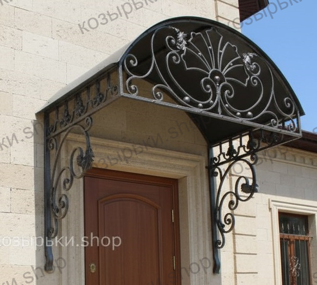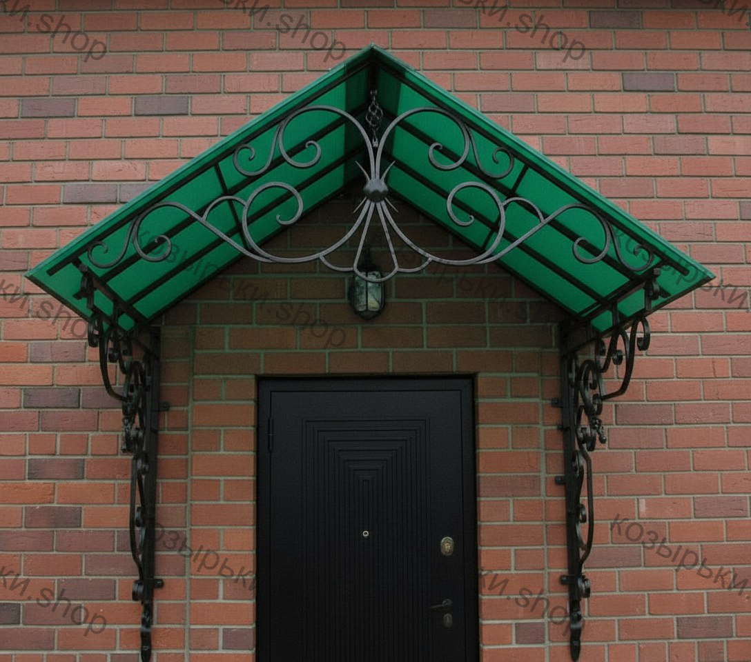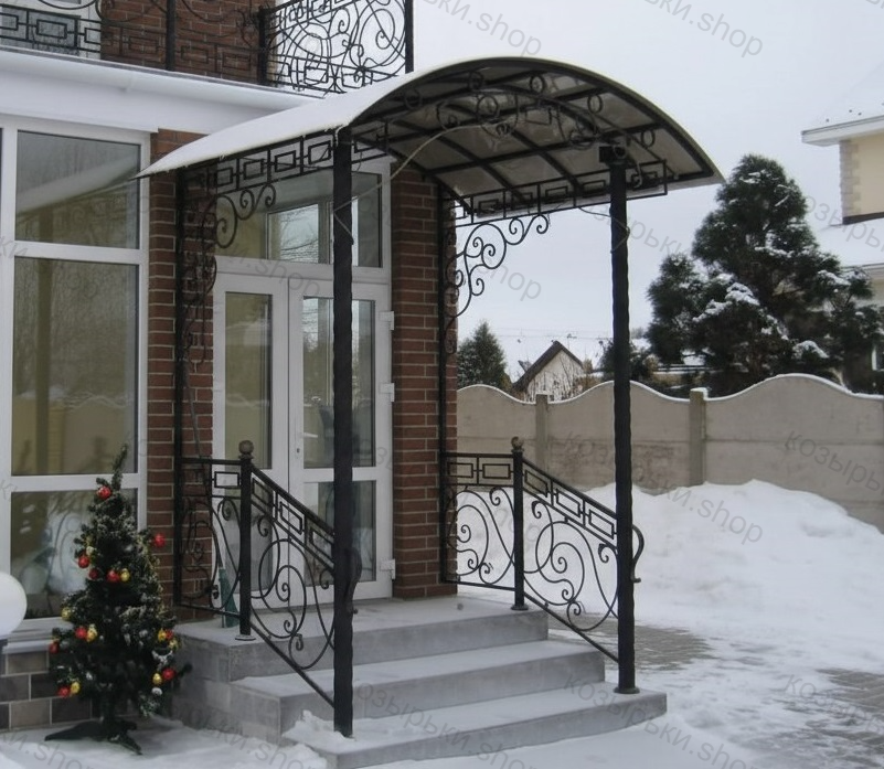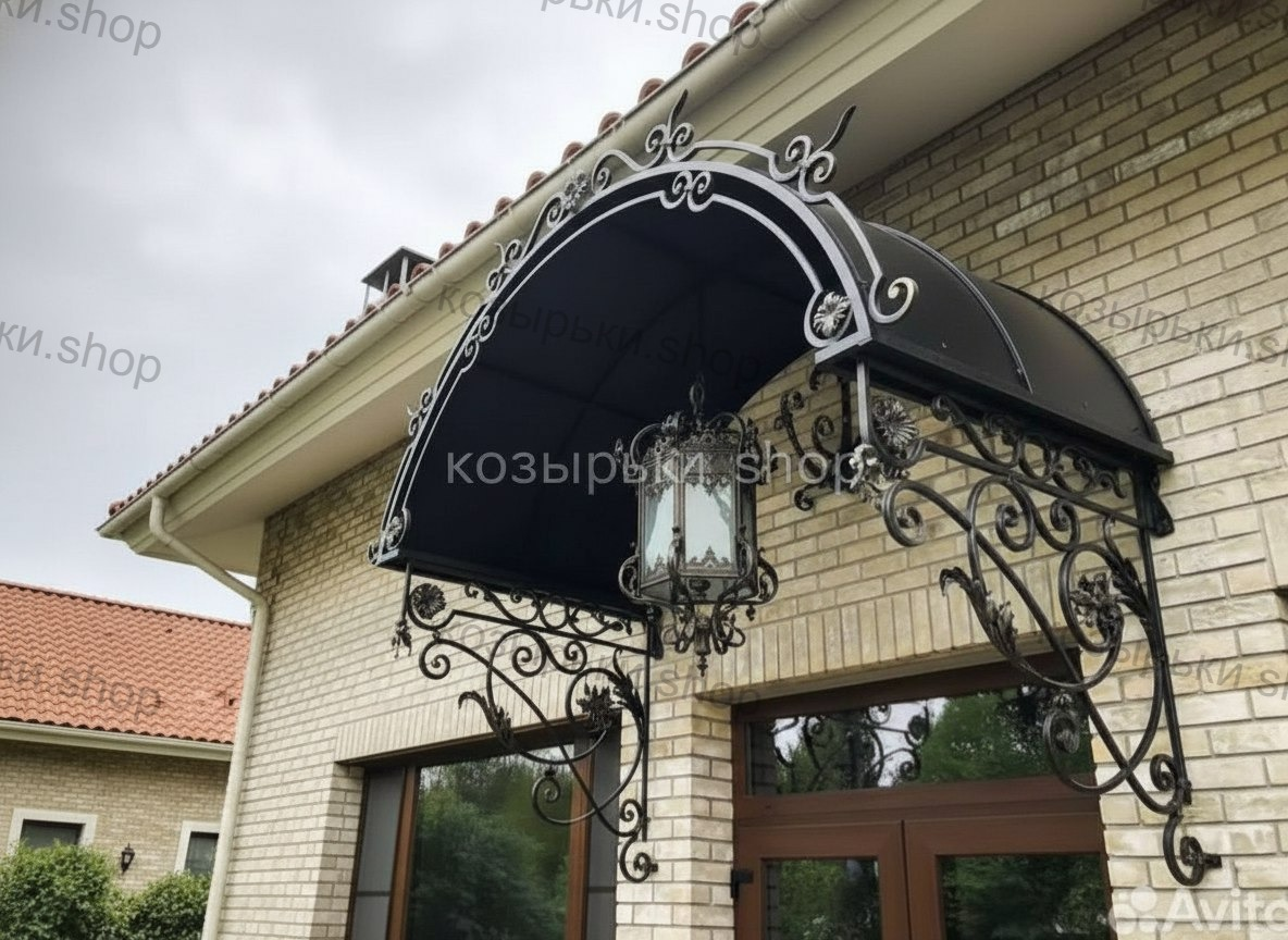 Кованый козырёк от козырьки.Shop — это не просто функциональный элемент защиты, а настоящее украшение фасада вашего дома, магазина или офиса. Почему стоит выбрать именно кованый козырёк? Козырёк надёжно укроет входную зону от дождя, снега и палящего солнца. Вы сможете спокойно открыть дверь, достать ключи или встретить гостей, не боясь непогоды. -Изделия изготавливаются из высококачественного металла с применением технологии художественной ковки. Специальная обработка (грунтовка и защитное покрытие) предотвращает коррозию и гарантирует многолетнюю службу конструкции. -Кованые узоры придают козырьку изысканный, благородный вид. Элегантные изгибы и орнаменты превращают обычный навес в произведение искусства, подчёркивая статус и индивидуальность владельца. -Козырёк гармонично сочетается с другими коваными элементами: перилами, лестницами, воротами, заборами. Он впишется в любой архитектурный стиль — от классики до модерна. -Мы предлагаем как готовые решения из каталога, так и изготовление козырька по персональному эскизу. Вы можете выбрать форму, размер и узор, которые идеально подойдут к вашему фасаду. Варианты исполнения: односкатные — лаконичные и практичные; арочные — изящные и популярные; волнообразные — с оригинальным изгибом; прямые — максимально устойчивые; шаровидные — эффектные «зонтики». Материалы на выбор: металлические листы (прочность и надёжность); монолитный или сотовый поликарбонат (лёгкость и светопропускание). Преимущества заказа у нас: профессиональный дизайн‑проект с учётом особенностей вашего здания; качественное изготовление с соблюдением всех технологических норм; аккуратная покраска в выбранный вами цвет; оперативная установка опытными мастерами. Преобразите входную зону с кованым козырьком от козырьки.Shop — сочетайте практичность с эстетикой, создавая неповторимый облик вашего здания!