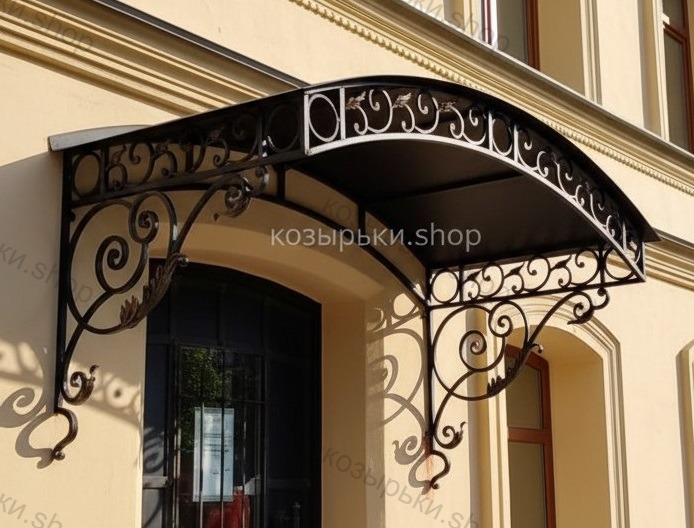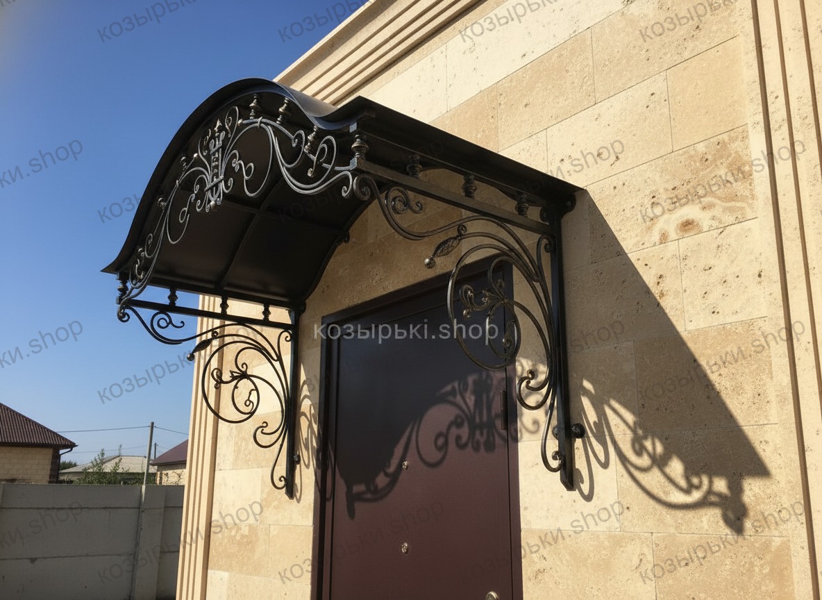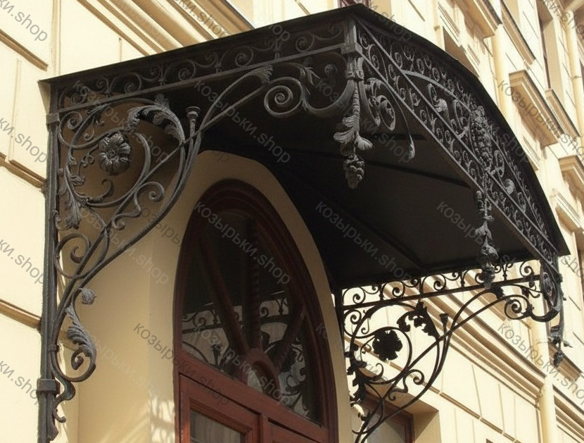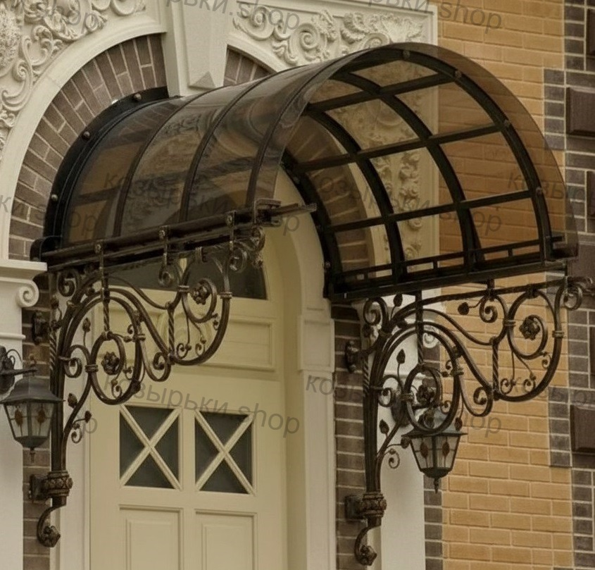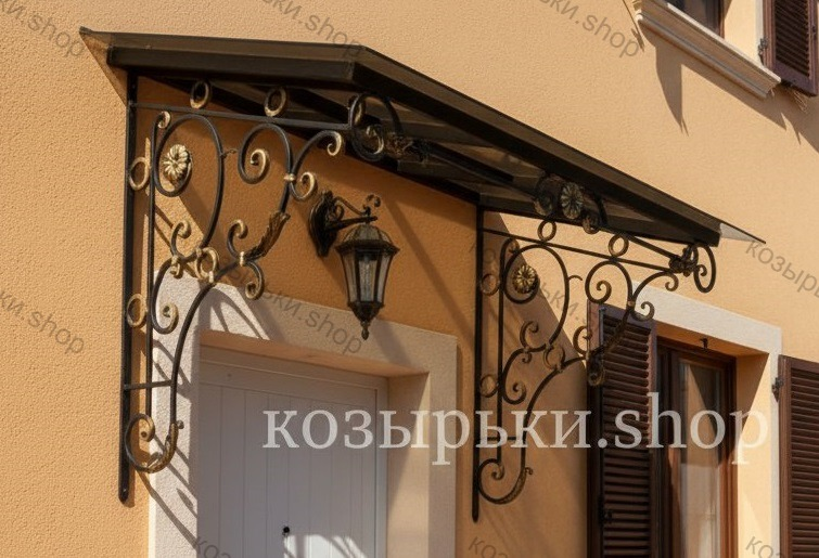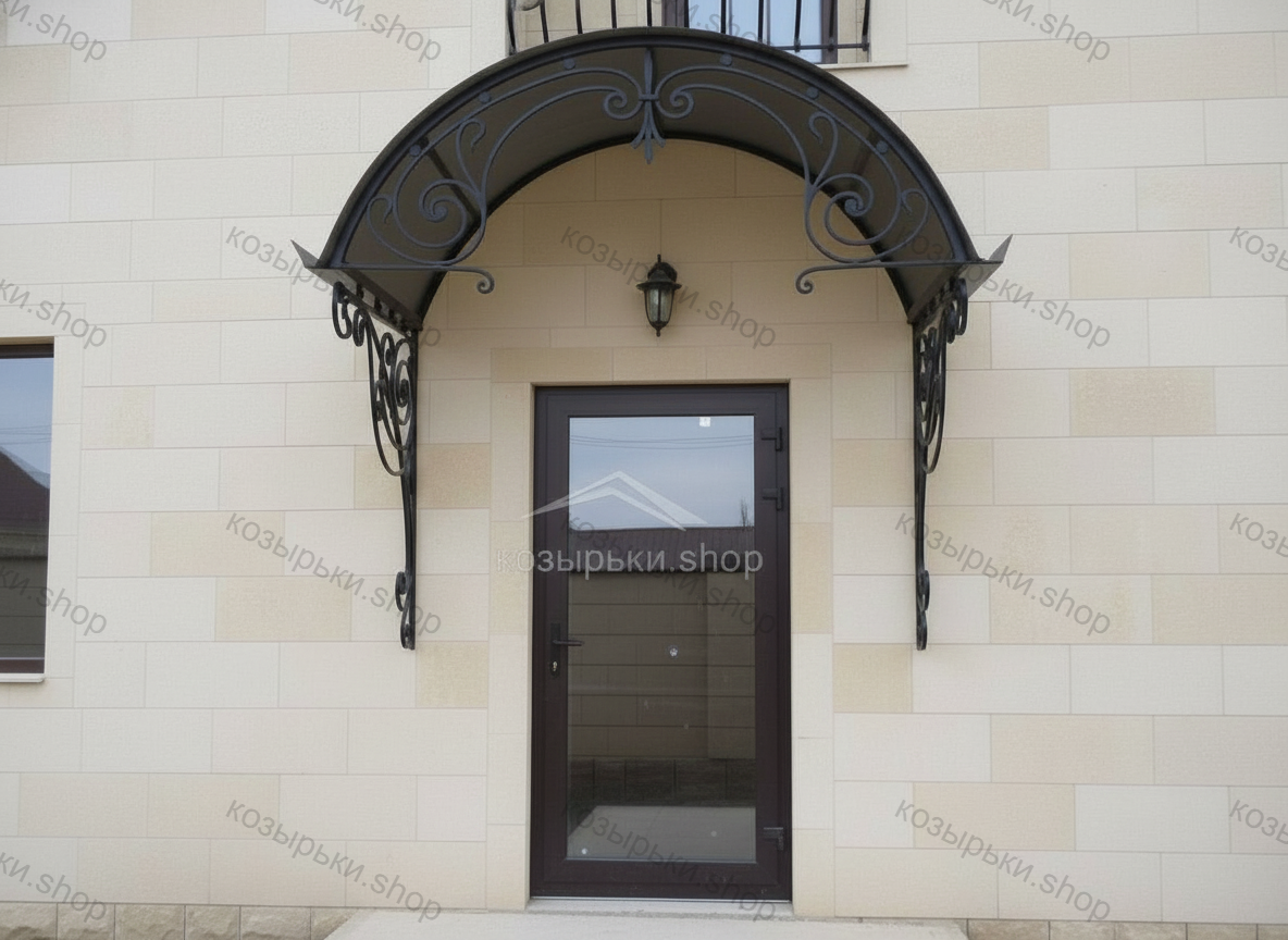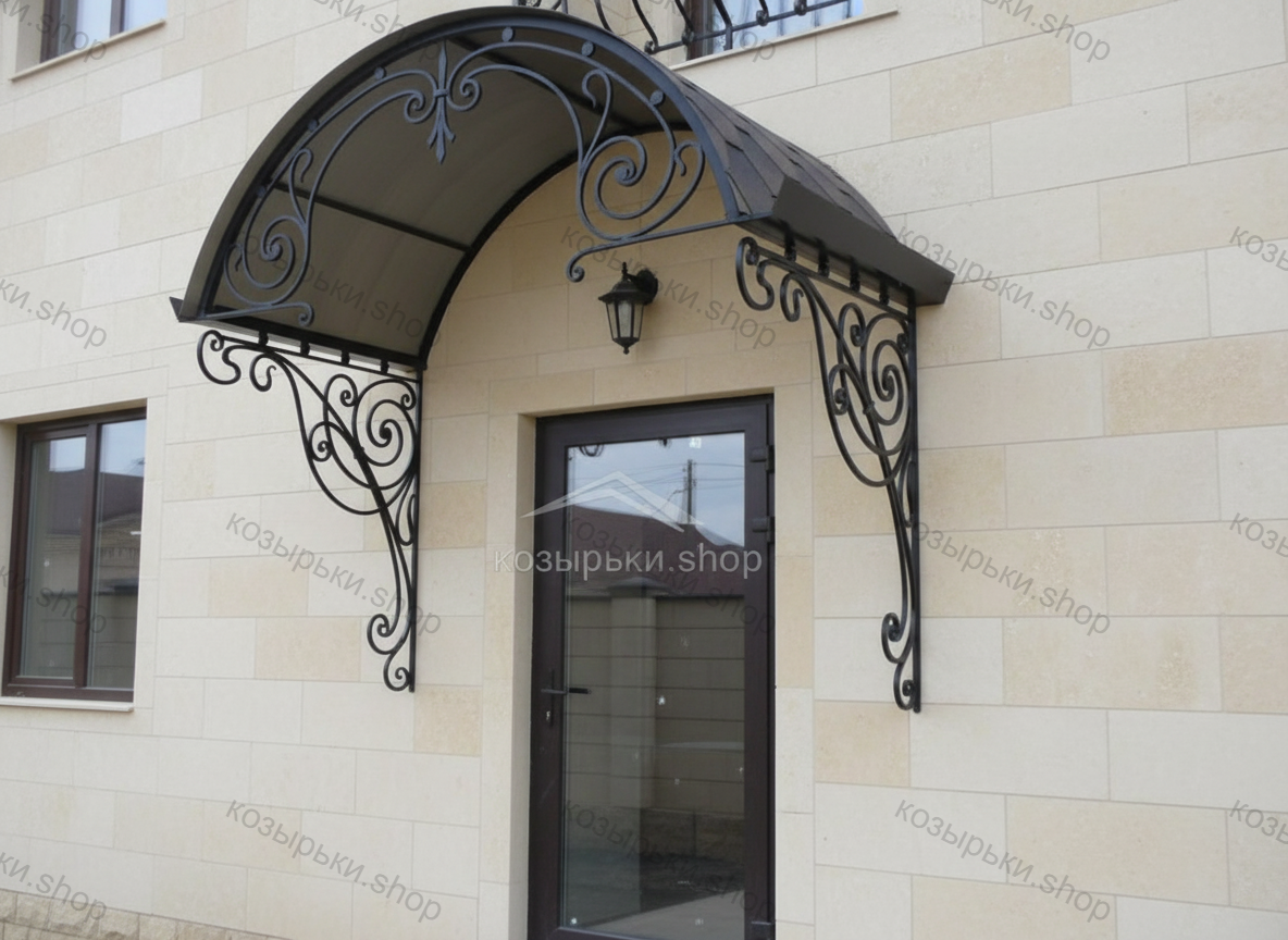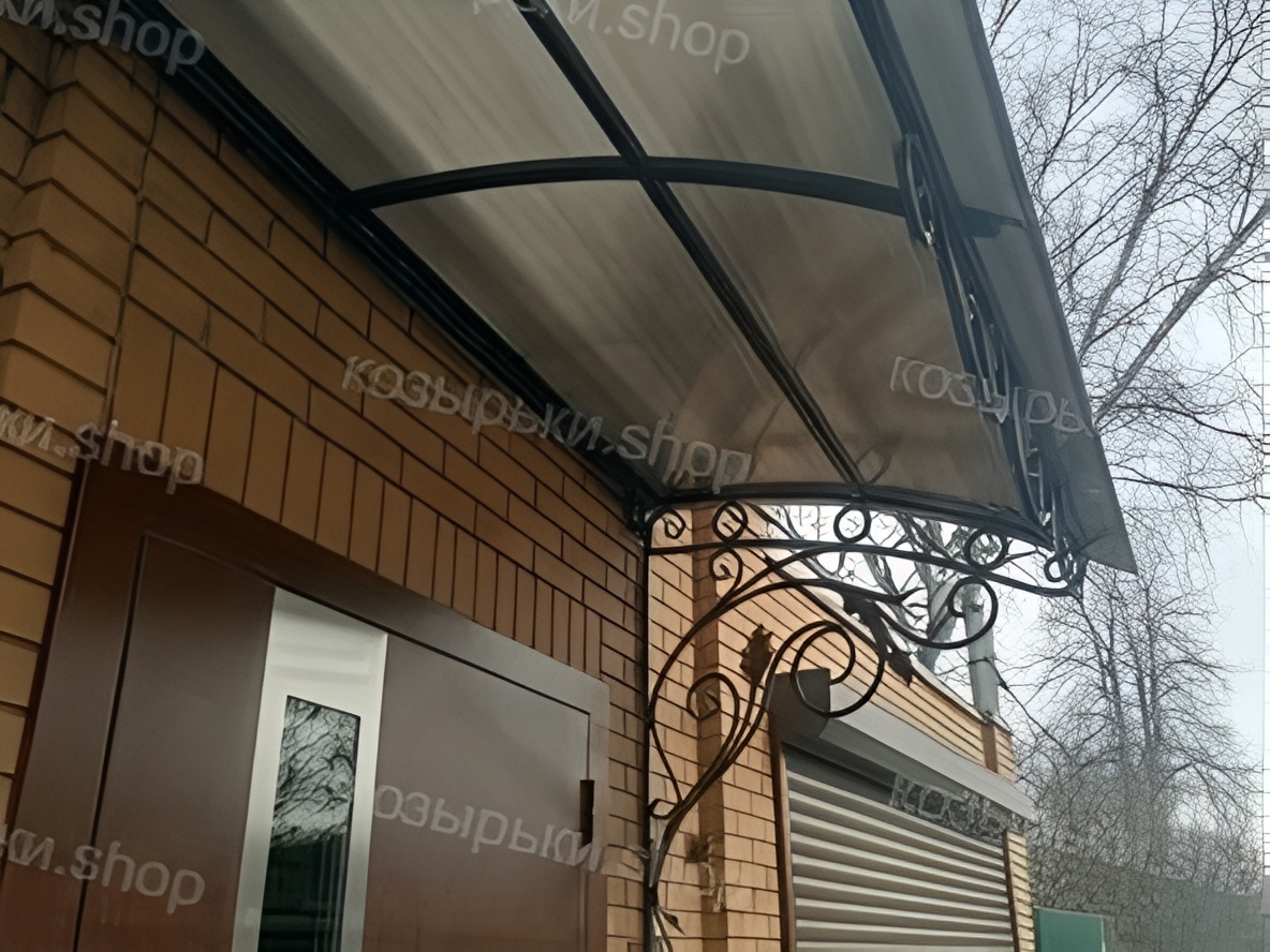Кованый козырёк от козырьки.Shop — это не просто функциональный элемент защиты, а настоящее украшение фасада вашего дома, магазина или офиса. Почему стоит выбрать именно кованый козырёк? Козырёк надёжно укроет входную зону от дождя, снега и палящего солнца. Вы сможете спокойно открыть дверь, достать ключи или встретить гостей, не боясь непогоды. -Изделия изготавливаются из высококачественного металла с применением технологии художественной ковки. Специальная обработка (грунтовка и защитное покрытие) предотвращает коррозию и гарантирует многолетнюю службу конструкции. -Кованые узоры придают козырьку изысканный, благородный вид. Элегантные изгибы и орнаменты превращают обычный навес в произведение искусства, подчёркивая статус и индивидуальность владельца. -Козырёк гармонично сочетается с другими коваными элементами: перилами, лестницами, воротами, заборами. Он впишется в любой архитектурный стиль — от классики до модерна. -Мы предлагаем как готовые решения из каталога, так и изготовление козырька по персональному эскизу. Вы можете выбрать форму, размер и узор, которые идеально подойдут к вашему фасаду. Варианты исполнения: односкатные — лаконичные и практичные; арочные — изящные и популярные; волнообразные — с оригинальным изгибом; прямые — максимально устойчивые; шаровидные — эффектные «зонтики». Материалы на выбор: металлические листы (прочность и надёжность); монолитный или сотовый поликарбонат (лёгкость и светопропускание). Преимущества заказа у нас: профессиональный дизайн‑проект с учётом особенностей вашего здания; качественное изготовление с соблюдением всех технологических норм; аккуратная покраска в выбранный вами цвет; оперативная установка опытными мастерами. Преобразите входную зону с кованым козырьком от козырьки.Shop — сочетайте практичность с эстетикой, создавая неповторимый облик вашего здания!