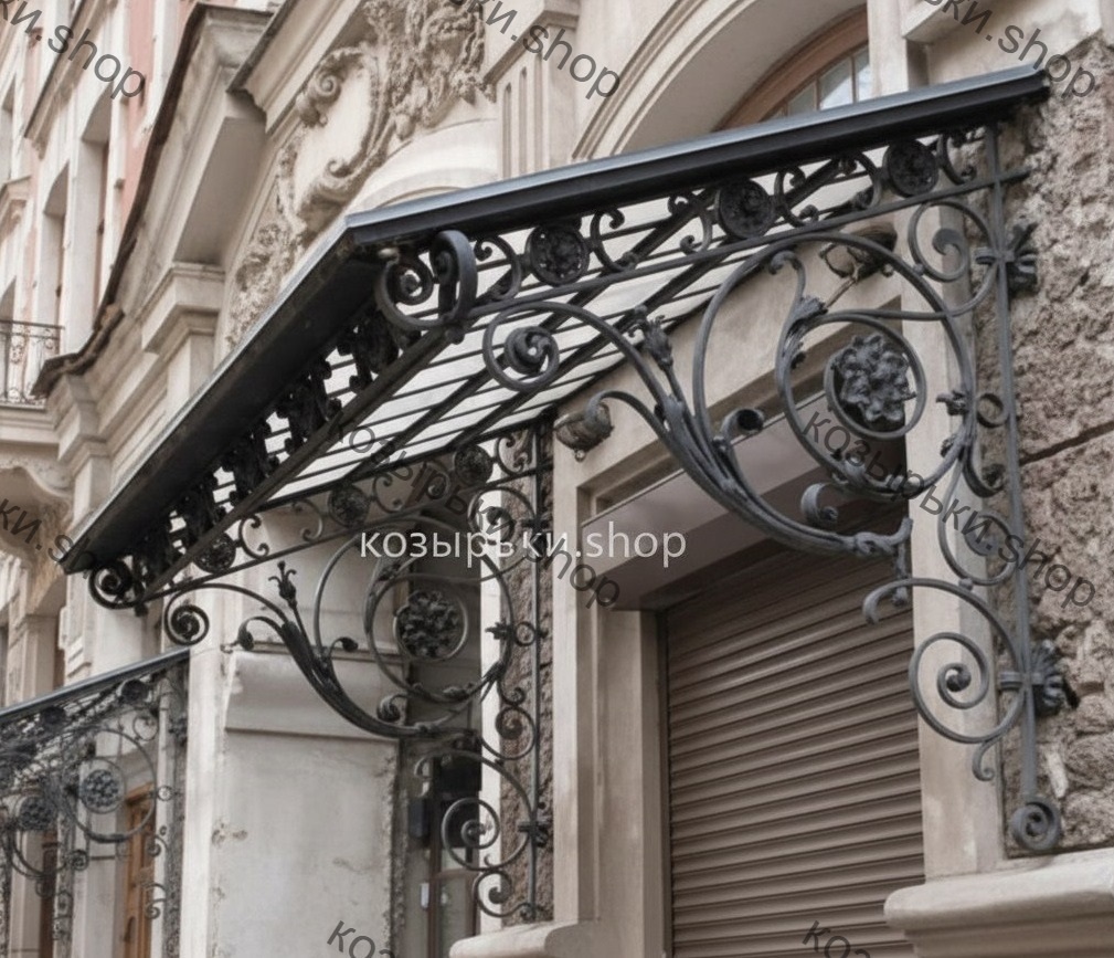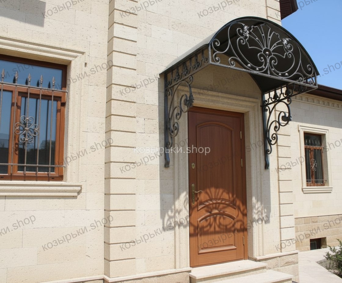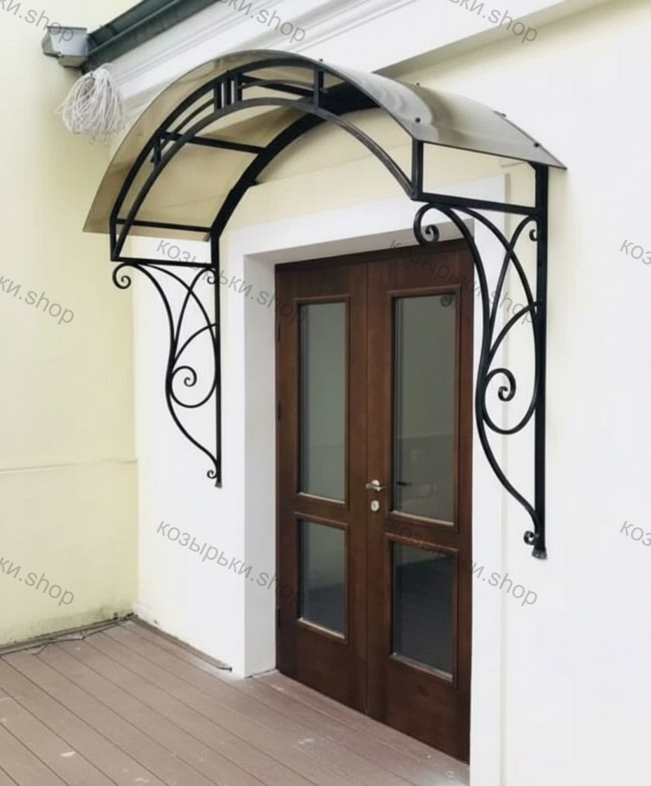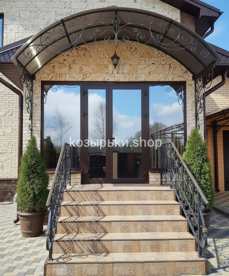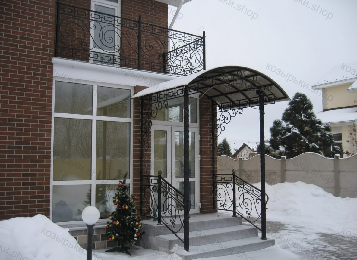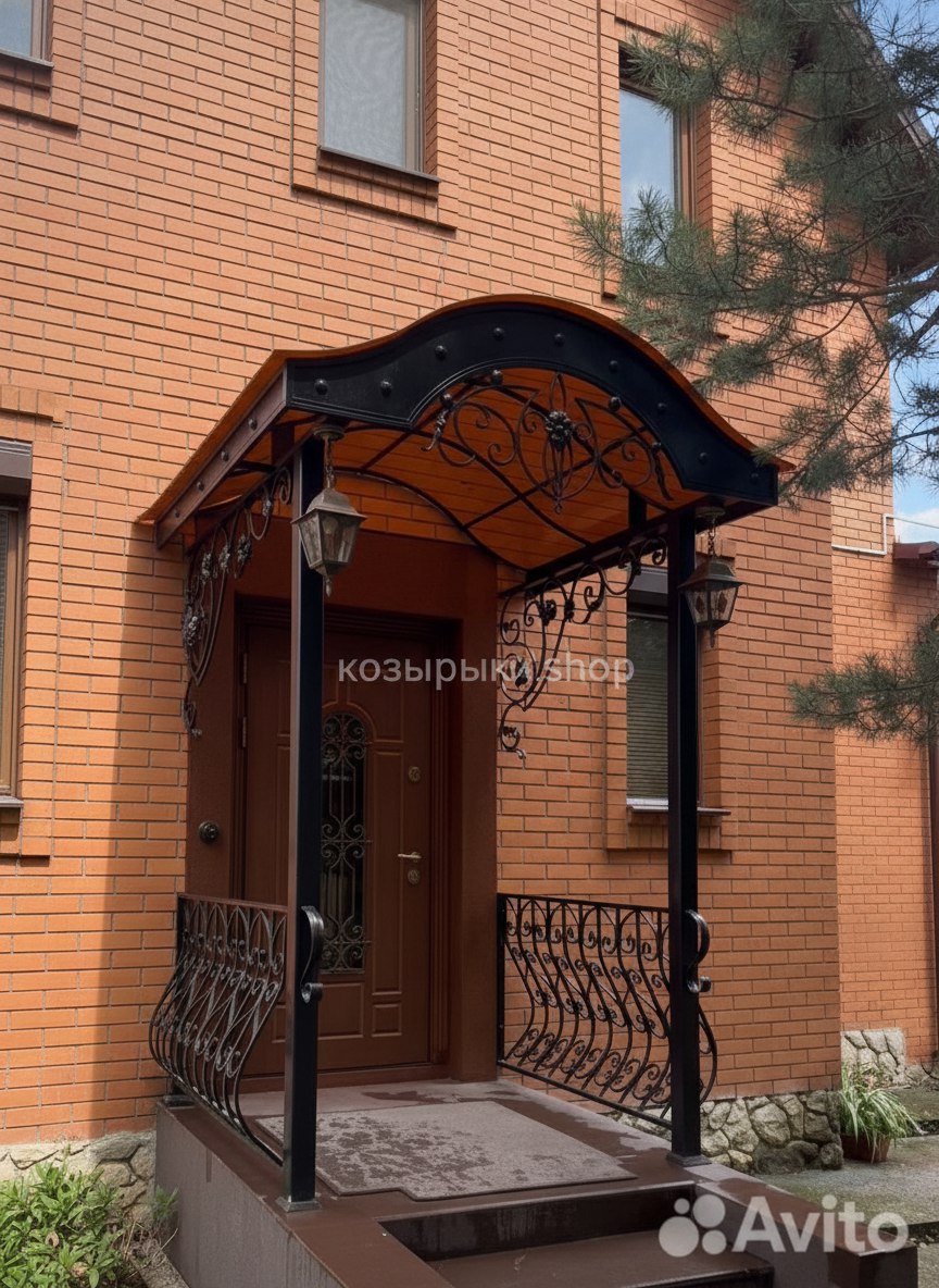 Кованый козырёк от козырьки.Shop — это не просто функциональный элемент защиты, а настоящее украшение фасада вашего дома, магазина или офиса. Почему стоит выбрать именно кованый козырёк? Козырёк надёжно укроет входную зону от дождя, снега и палящего солнца. Вы сможете спокойно открыть дверь, достать ключи или встретить гостей, не боясь непогоды. -Изделия изготавливаются из высококачественного металла с применением технологии художественной ковки. Специальная обработка (грунтовка и защитное покрытие) предотвращает коррозию и гарантирует многолетнюю службу конструкции. -Кованые узоры придают козырьку изысканный, благородный вид. Элегантные изгибы и орнаменты превращают обычный навес в произведение искусства, подчёркивая статус и индивидуальность владельца. -Козырёк гармонично сочетается с другими коваными элементами: перилами, лестницами, воротами, заборами. Он впишется в любой архитектурный стиль — от классики до модерна. -Мы предлагаем как готовые решения из каталога, так и изготовление козырька по персональному эскизу. Вы можете выбрать форму, размер и узор, которые идеально подойдут к вашему фасаду. Варианты исполнения: односкатные — лаконичные и практичные; арочные — изящные и популярные; волнообразные — с оригинальным изгибом; прямые — максимально устойчивые; шаровидные — эффектные «зонтики». Материалы на выбор: металлические листы (прочность и надёжность); монолитный или сотовый поликарбонат (лёгкость и светопропускание). Преимущества заказа у нас: профессиональный дизайн‑проект с учётом особенностей вашего здания; качественное изготовление с соблюдением всех технологических норм; аккуратная покраска в выбранный вами цвет; оперативная установка опытными мастерами. Преобразите входную зону с кованым козырьком от козырьки.Shop — сочетайте практичность с эстетикой, создавая неповторимый облик вашего здания!