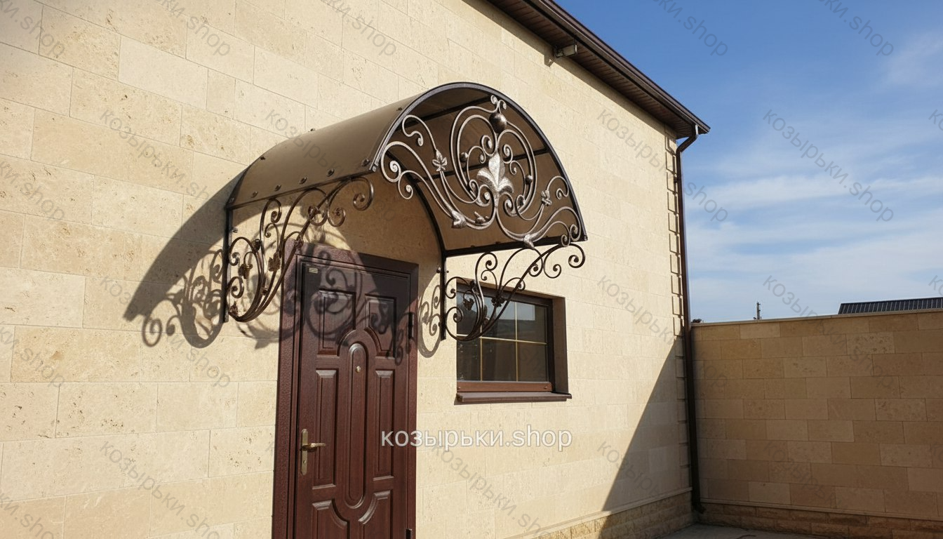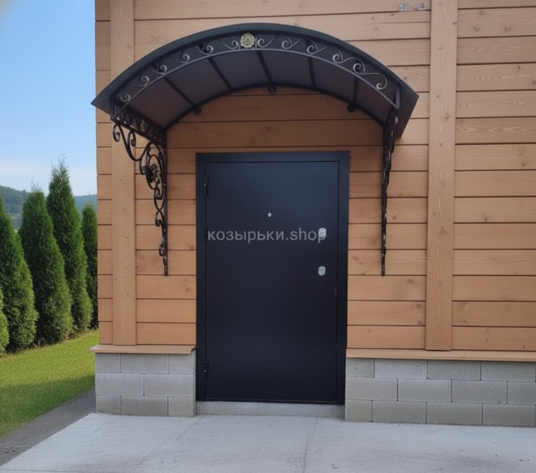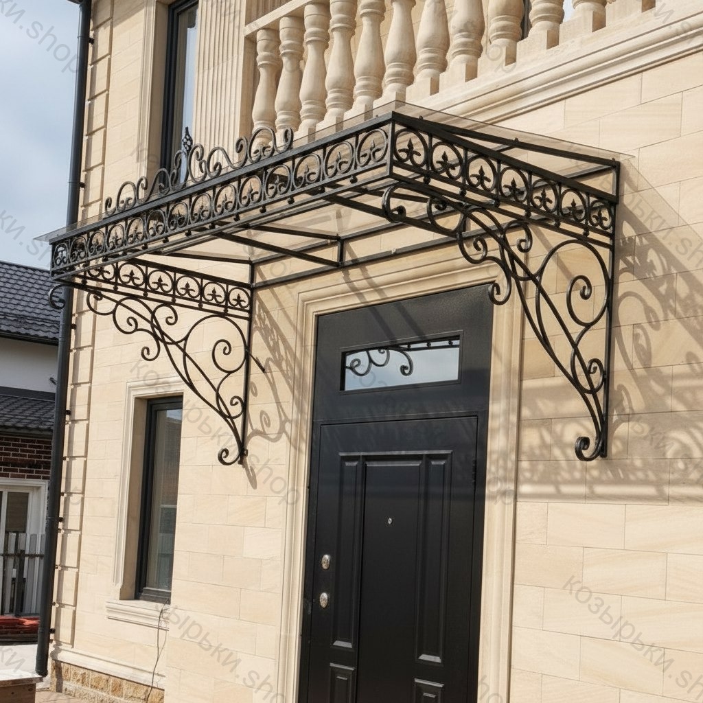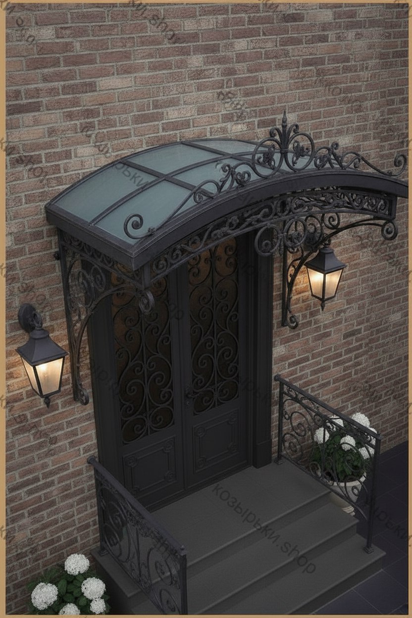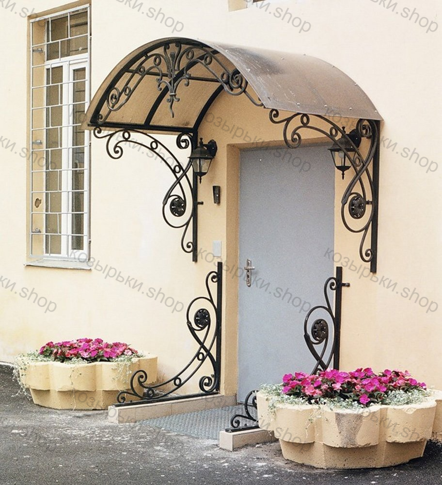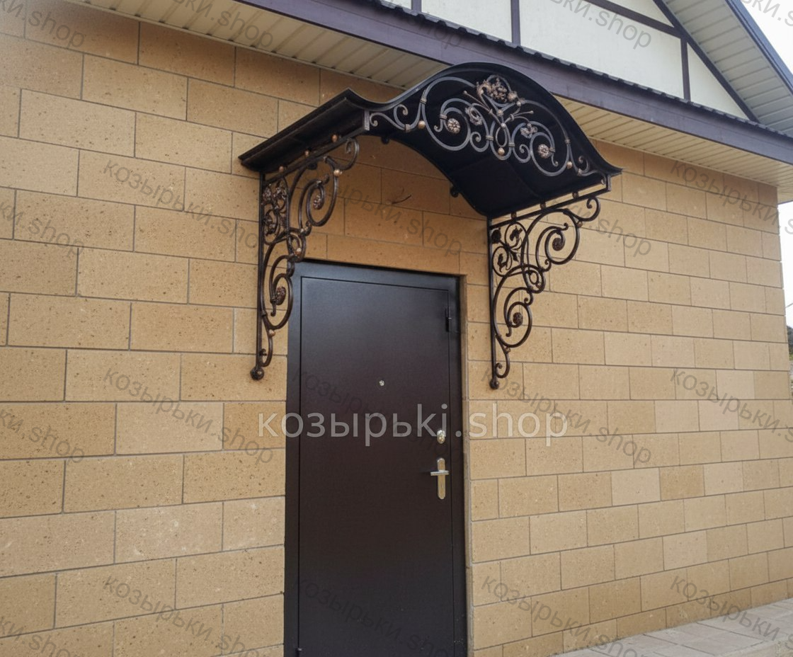 Кованый козырёк от козырьки.Shop — это не просто функциональный элемент защиты, а настоящее украшение фасада вашего дома, магазина или офиса. Почему стоит выбрать именно кованый козырёк? Козырёк надёжно укроет входную зону от дождя, снега и палящего солнца. Вы сможете спокойно открыть дверь, достать ключи или встретить гостей, не боясь непогоды. -Изделия изготавливаются из высококачественного металла с применением технологии художественной ковки. Специальная обработка (грунтовка и защитное покрытие) предотвращает коррозию и гарантирует многолетнюю службу конструкции. -Кованые узоры придают козырьку изысканный, благородный вид. Элегантные изгибы и орнаменты превращают обычный навес в произведение искусства, подчёркивая статус и индивидуальность владельца. -Козырёк гармонично сочетается с другими коваными элементами: перилами, лестницами, воротами, заборами. Он впишется в любой архитектурный стиль — от классики до модерна. -Мы предлагаем как готовые решения из каталога, так и изготовление козырька по персональному эскизу. Вы можете выбрать форму, размер и узор, которые идеально подойдут к вашему фасаду. Варианты исполнения: односкатные — лаконичные и практичные; арочные — изящные и популярные; волнообразные — с оригинальным изгибом; прямые — максимально устойчивые; шаровидные — эффектные «зонтики». Материалы на выбор: металлические листы (прочность и надёжность); монолитный или сотовый поликарбонат (лёгкость и светопропускание). Преимущества заказа у нас: профессиональный дизайн‑проект с учётом особенностей вашего здания; качественное изготовление с соблюдением всех технологических норм; аккуратная покраска в выбранный вами цвет; оперативная установка опытными мастерами. Преобразите входную зону с кованым козырьком от козырьки.Shop — сочетайте практичность с эстетикой, создавая неповторимый облик вашего здания!