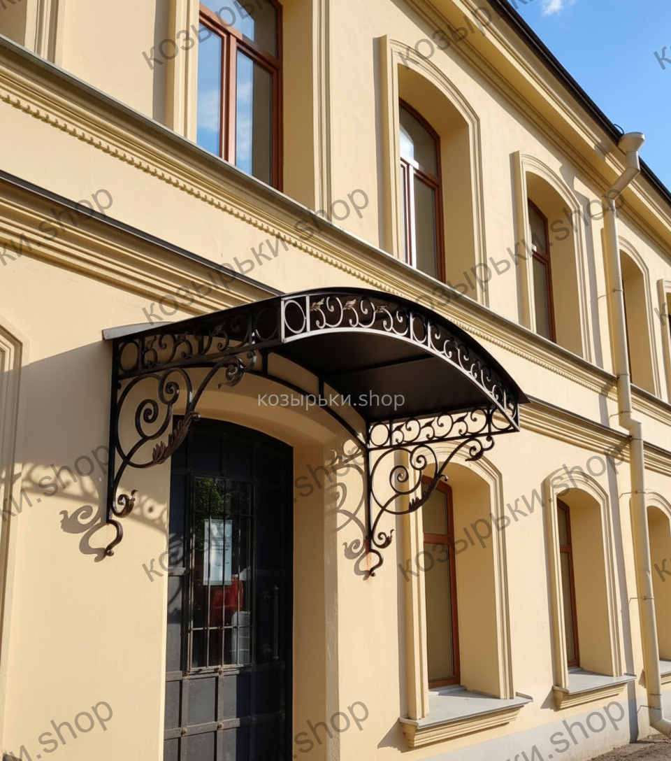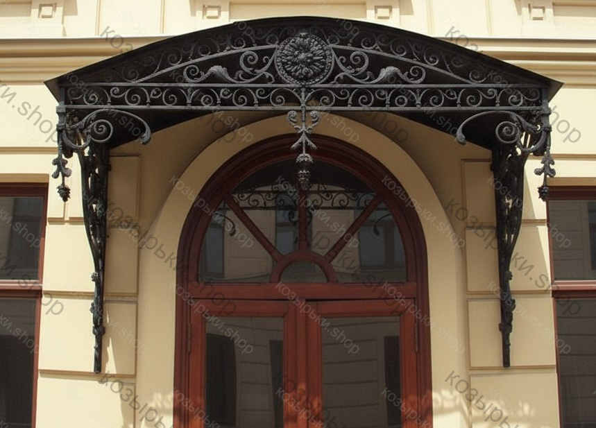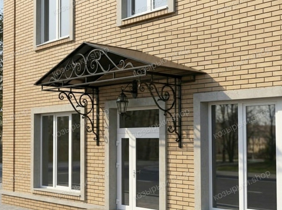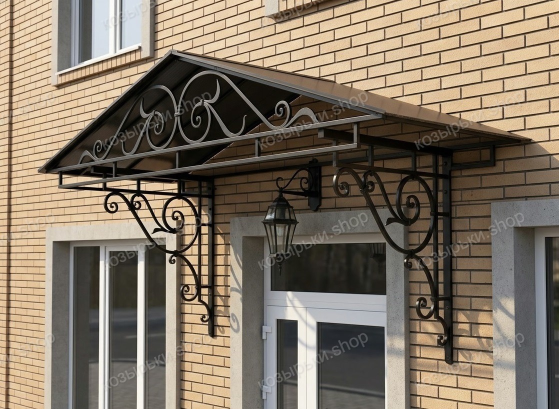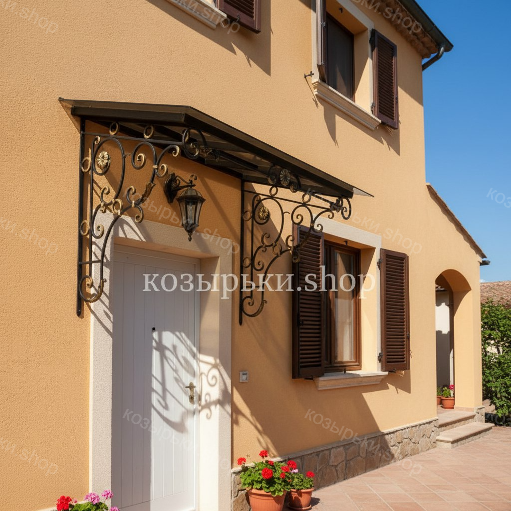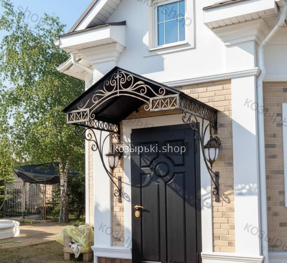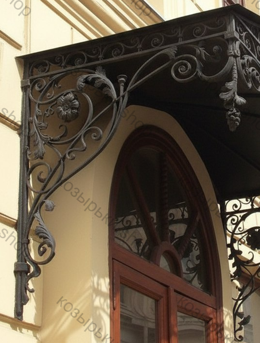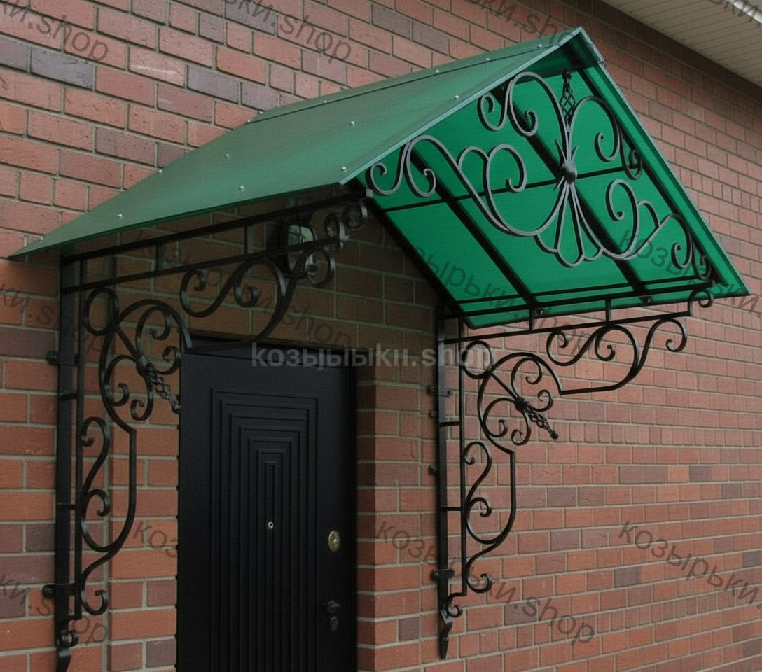 Кованый козырёк от козырьки.Shop — это не просто функциональный элемент защиты, а настоящее украшение фасада вашего дома, магазина или офиса. Почему стоит выбрать именно кованый козырёк? Козырёк надёжно укроет входную зону от дождя, снега и палящего солнца. Вы сможете спокойно открыть дверь, достать ключи или встретить гостей, не боясь непогоды. -Изделия изготавливаются из высококачественного металла с применением технологии художественной ковки. Специальная обработка (грунтовка и защитное покрытие) предотвращает коррозию и гарантирует многолетнюю службу конструкции. -Кованые узоры придают козырьку изысканный, благородный вид. Элегантные изгибы и орнаменты превращают обычный навес в произведение искусства, подчёркивая статус и индивидуальность владельца. -Козырёк гармонично сочетается с другими коваными элементами: перилами, лестницами, воротами, заборами. Он впишется в любой архитектурный стиль — от классики до модерна. -Мы предлагаем как готовые решения из каталога, так и изготовление козырька по персональному эскизу. Вы можете выбрать форму, размер и узор, которые идеально подойдут к вашему фасаду. Варианты исполнения: односкатные — лаконичные и практичные; арочные — изящные и популярные; волнообразные — с оригинальным изгибом; прямые — максимально устойчивые; шаровидные — эффектные «зонтики». Материалы на выбор: металлические листы (прочность и надёжность); монолитный или сотовый поликарбонат (лёгкость и светопропускание). Преимущества заказа у нас: профессиональный дизайн‑проект с учётом особенностей вашего здания; качественное изготовление с соблюдением всех технологических норм; аккуратная покраска в выбранный вами цвет; оперативная установка опытными мастерами. Преобразите входную зону с кованым козырьком от козырьки.Shop — сочетайте практичность с эстетикой, создавая неповторимый облик вашего здания!