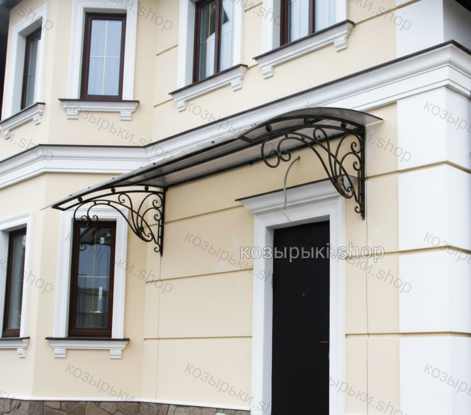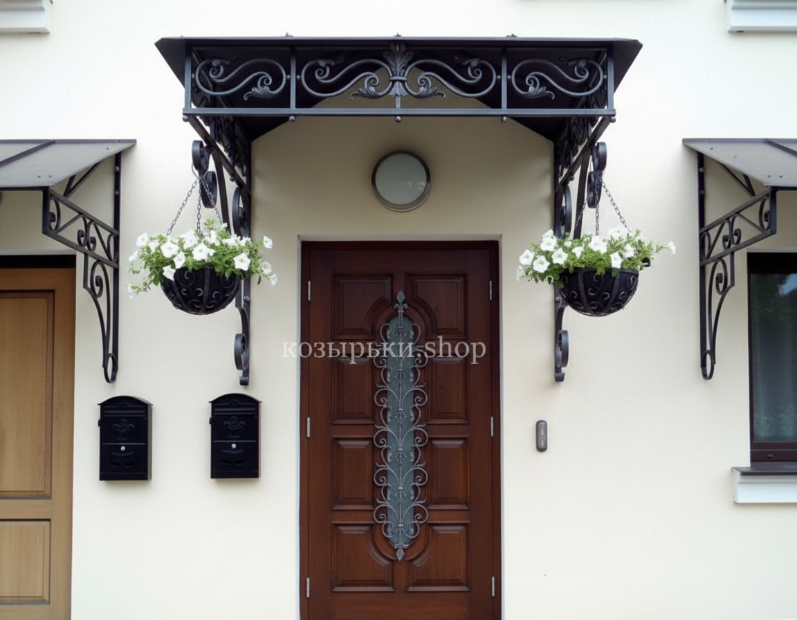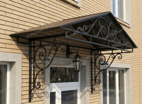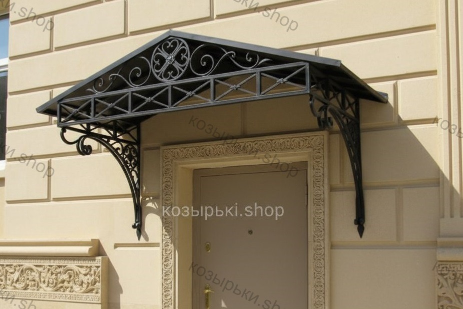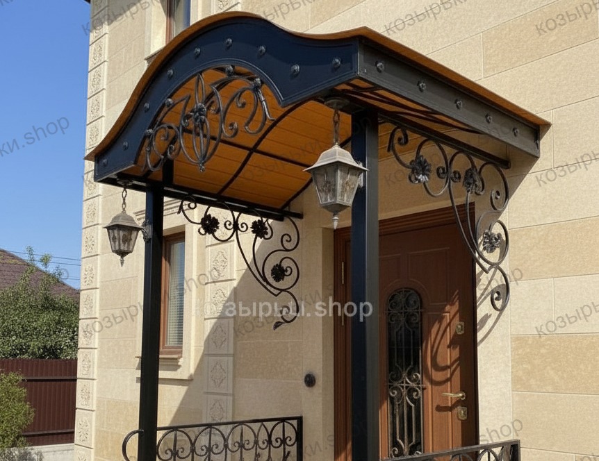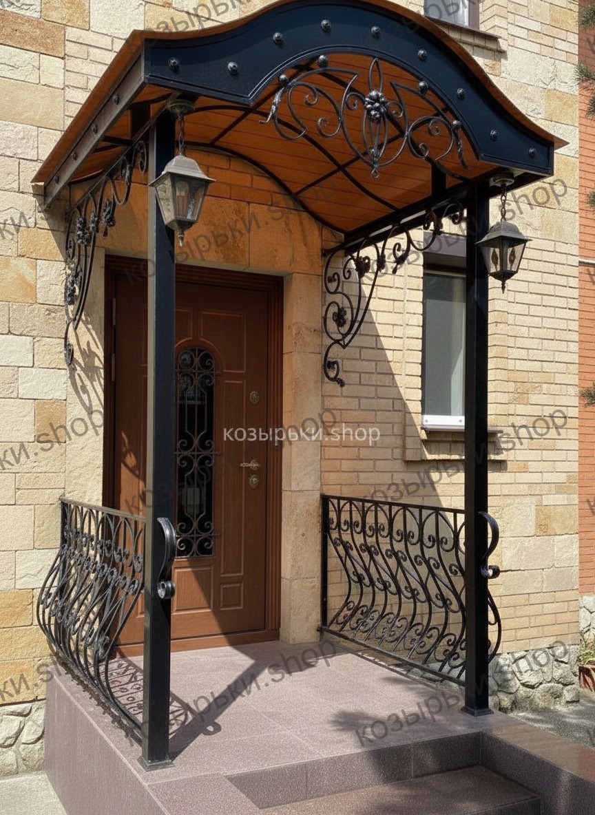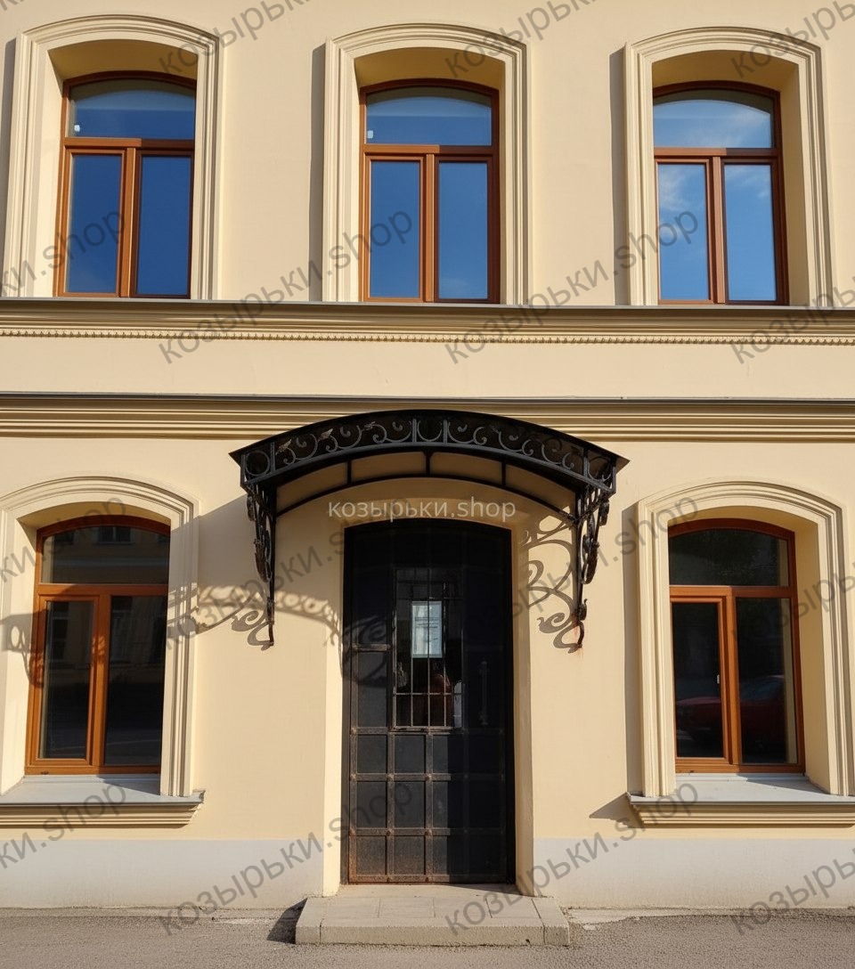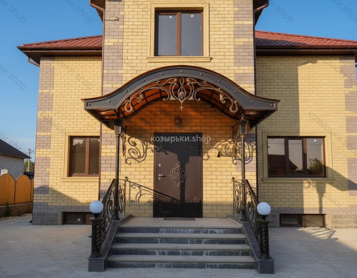 Кованый козырёк от козырьки.Shop — это не просто функциональный элемент защиты, а настоящее украшение фасада вашего дома, магазина или офиса. Почему стоит выбрать именно кованый козырёк? Козырёк надёжно укроет входную зону от дождя, снега и палящего солнца. Вы сможете спокойно открыть дверь, достать ключи или встретить гостей, не боясь непогоды. -Изделия изготавливаются из высококачественного металла с применением технологии художественной ковки. Специальная обработка (грунтовка и защитное покрытие) предотвращает коррозию и гарантирует многолетнюю службу конструкции. -Кованые узоры придают козырьку изысканный, благородный вид. Элегантные изгибы и орнаменты превращают обычный навес в произведение искусства, подчёркивая статус и индивидуальность владельца. -Козырёк гармонично сочетается с другими коваными элементами: перилами, лестницами, воротами, заборами. Он впишется в любой архитектурный стиль — от классики до модерна. -Мы предлагаем как готовые решения из каталога, так и изготовление козырька по персональному эскизу. Вы можете выбрать форму, размер и узор, которые идеально подойдут к вашему фасаду. Варианты исполнения: односкатные — лаконичные и практичные; арочные — изящные и популярные; волнообразные — с оригинальным изгибом; прямые — максимально устойчивые; шаровидные — эффектные «зонтики». Материалы на выбор: металлические листы (прочность и надёжность); монолитный или сотовый поликарбонат (лёгкость и светопропускание). Преимущества заказа у нас: профессиональный дизайн‑проект с учётом особенностей вашего здания; качественное изготовление с соблюдением всех технологических норм; аккуратная покраска в выбранный вами цвет; оперативная установка опытными мастерами. Преобразите входную зону с кованым козырьком от козырьки.Shop — сочетайте практичность с эстетикой, создавая неповторимый облик вашего здания!