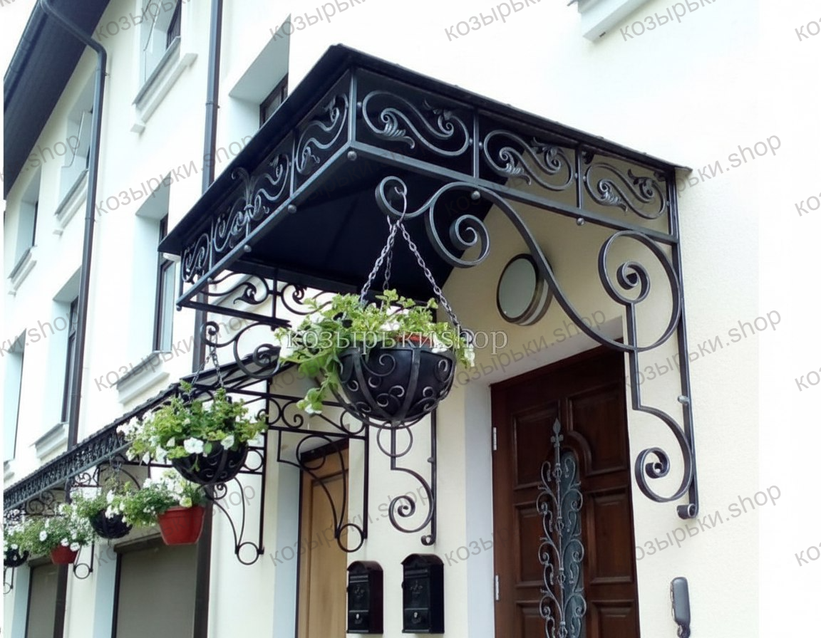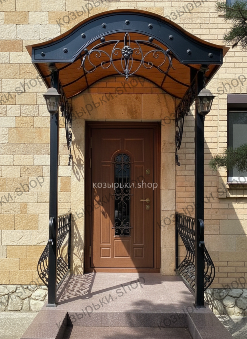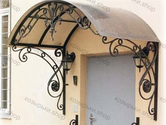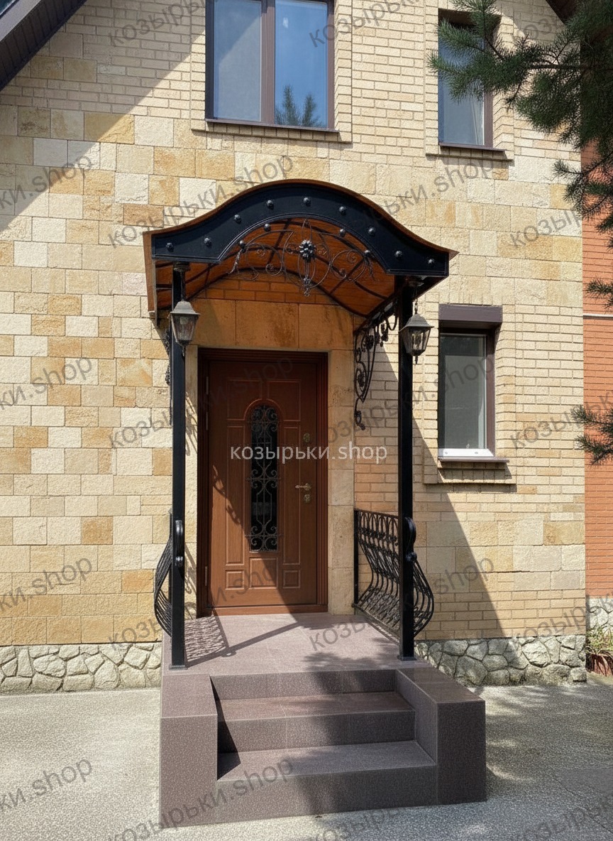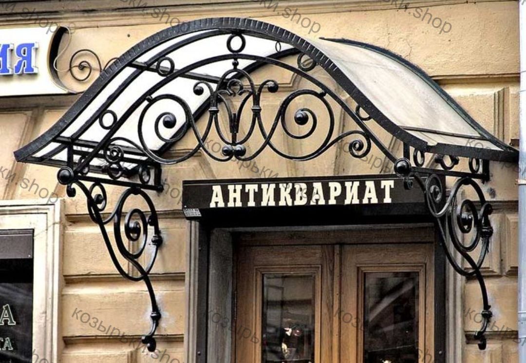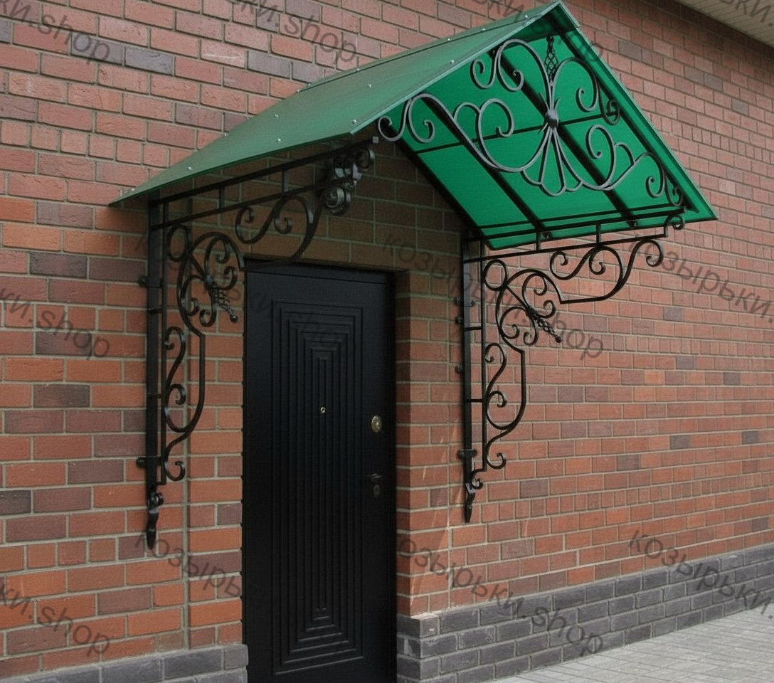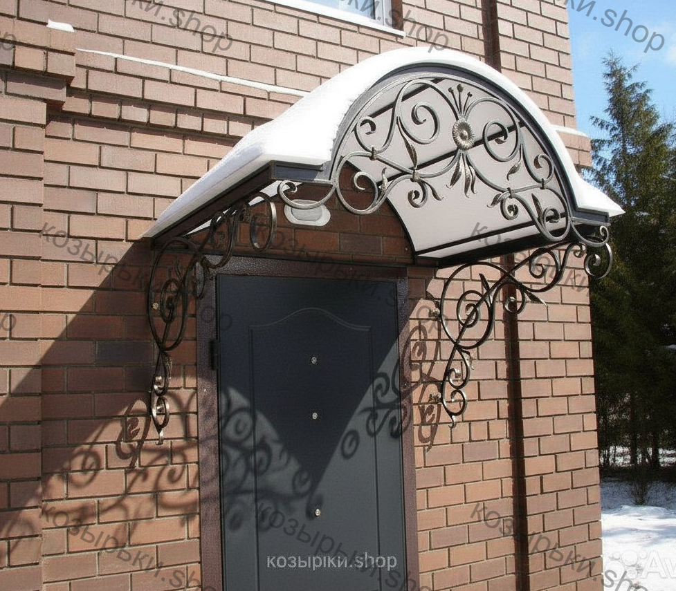 Кованый козырёк от козырьки.Shop — это не просто функциональный элемент защиты, а настоящее украшение фасада вашего дома, магазина или офиса. Почему стоит выбрать именно кованый козырёк? Козырёк надёжно укроет входную зону от дождя, снега и палящего солнца. Вы сможете спокойно открыть дверь, достать ключи или встретить гостей, не боясь непогоды. -Изделия изготавливаются из высококачественного металла с применением технологии художественной ковки. Специальная обработка (грунтовка и защитное покрытие) предотвращает коррозию и гарантирует многолетнюю службу конструкции. -Кованые узоры придают козырьку изысканный, благородный вид. Элегантные изгибы и орнаменты превращают обычный навес в произведение искусства, подчёркивая статус и индивидуальность владельца. -Козырёк гармонично сочетается с другими коваными элементами: перилами, лестницами, воротами, заборами. Он впишется в любой архитектурный стиль — от классики до модерна. -Мы предлагаем как готовые решения из каталога, так и изготовление козырька по персональному эскизу. Вы можете выбрать форму, размер и узор, которые идеально подойдут к вашему фасаду. Варианты исполнения: односкатные — лаконичные и практичные; арочные — изящные и популярные; волнообразные — с оригинальным изгибом; прямые — максимально устойчивые; шаровидные — эффектные «зонтики». Материалы на выбор: металлические листы (прочность и надёжность); монолитный или сотовый поликарбонат (лёгкость и светопропускание). Преимущества заказа у нас: профессиональный дизайн‑проект с учётом особенностей вашего здания; качественное изготовление с соблюдением всех технологических норм; аккуратная покраска в выбранный вами цвет; оперативная установка опытными мастерами. Преобразите входную зону с кованым козырьком от козырьки.Shop — сочетайте практичность с эстетикой, создавая неповторимый облик вашего здания!