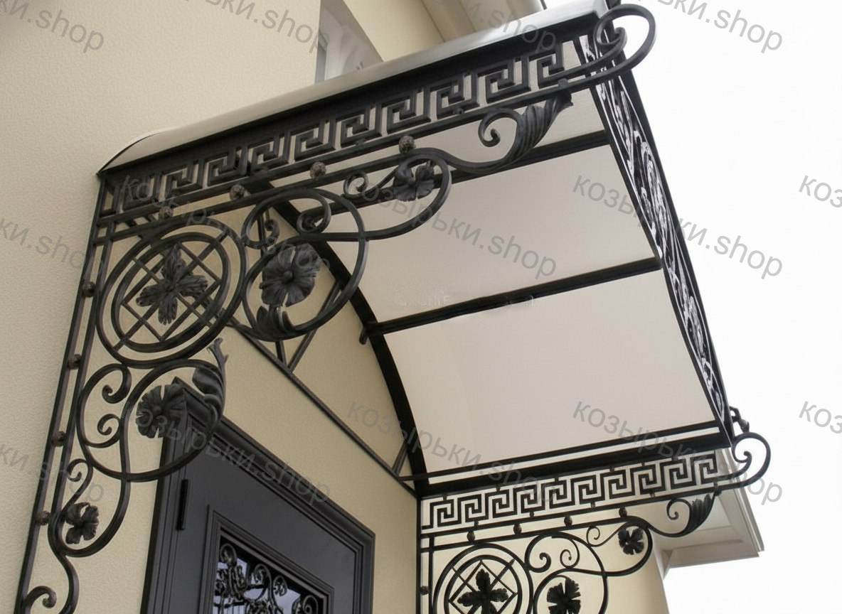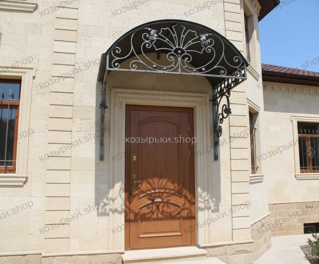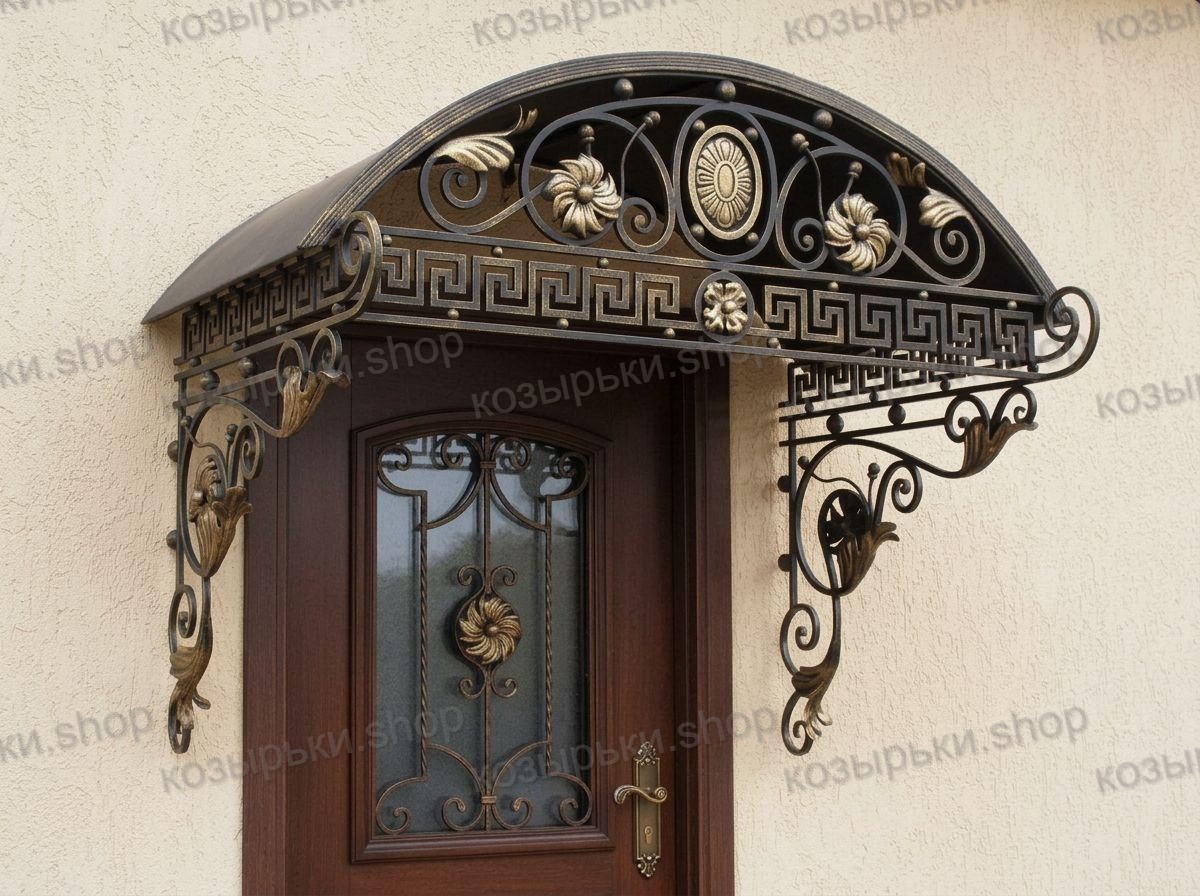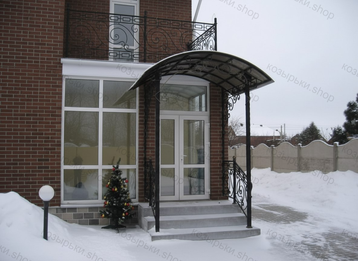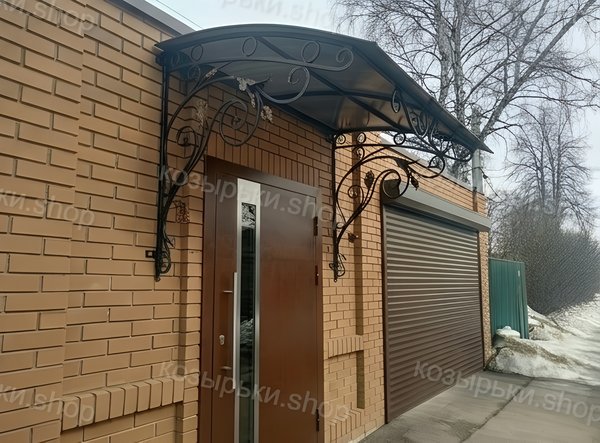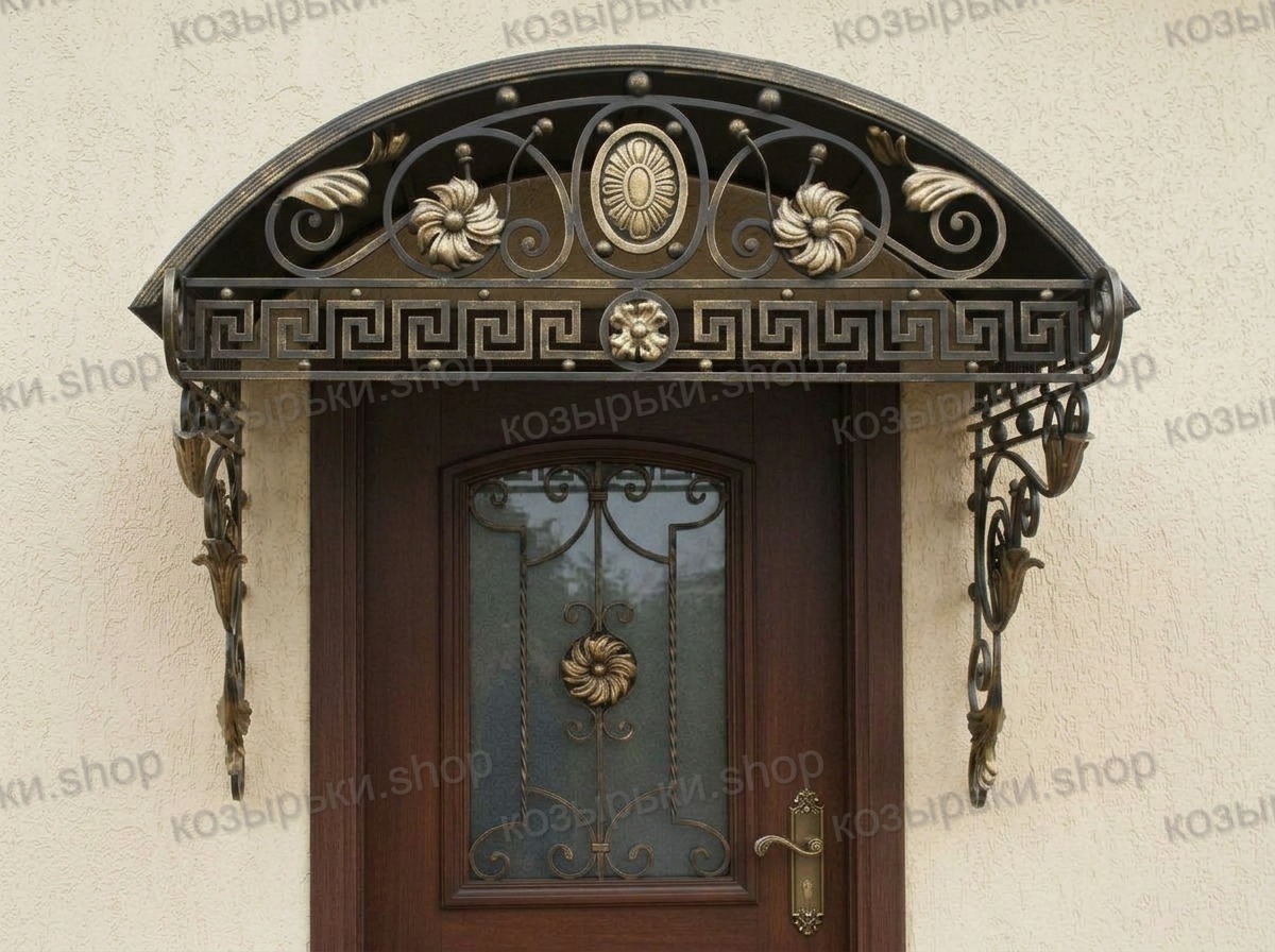 Кованый козырёк от козырьки.Shop — это не просто функциональный элемент защиты, а настоящее украшение фасада вашего дома, магазина или офиса. Почему стоит выбрать именно кованый козырёк? Козырёк надёжно укроет входную зону от дождя, снега и палящего солнца. Вы сможете спокойно открыть дверь, достать ключи или встретить гостей, не боясь непогоды. -Изделия изготавливаются из высококачественного металла с применением технологии художественной ковки. Специальная обработка (грунтовка и защитное покрытие) предотвращает коррозию и гарантирует многолетнюю службу конструкции. -Кованые узоры придают козырьку изысканный, благородный вид. Элегантные изгибы и орнаменты превращают обычный навес в произведение искусства, подчёркивая статус и индивидуальность владельца. -Козырёк гармонично сочетается с другими коваными элементами: перилами, лестницами, воротами, заборами. Он впишется в любой архитектурный стиль — от классики до модерна. -Мы предлагаем как готовые решения из каталога, так и изготовление козырька по персональному эскизу. Вы можете выбрать форму, размер и узор, которые идеально подойдут к вашему фасаду. Варианты исполнения: односкатные — лаконичные и практичные; арочные — изящные и популярные; волнообразные — с оригинальным изгибом; прямые — максимально устойчивые; шаровидные — эффектные «зонтики». Материалы на выбор: металлические листы (прочность и надёжность); монолитный или сотовый поликарбонат (лёгкость и светопропускание). Преимущества заказа у нас: профессиональный дизайн‑проект с учётом особенностей вашего здания; качественное изготовление с соблюдением всех технологических норм; аккуратная покраска в выбранный вами цвет; оперативная установка опытными мастерами. Преобразите входную зону с кованым козырьком от козырьки.Shop — сочетайте практичность с эстетикой, создавая неповторимый облик вашего здания!