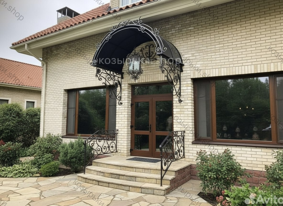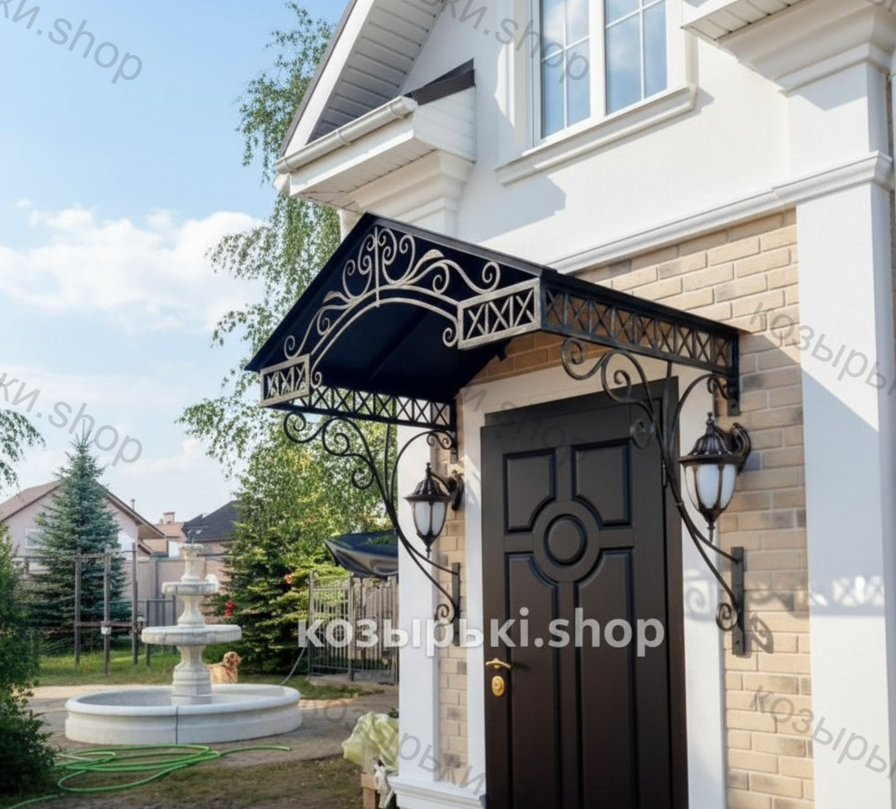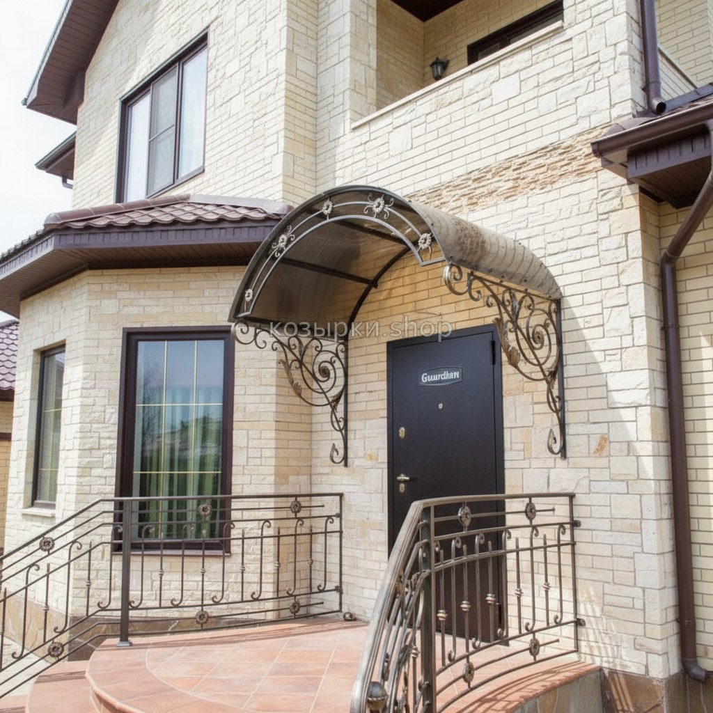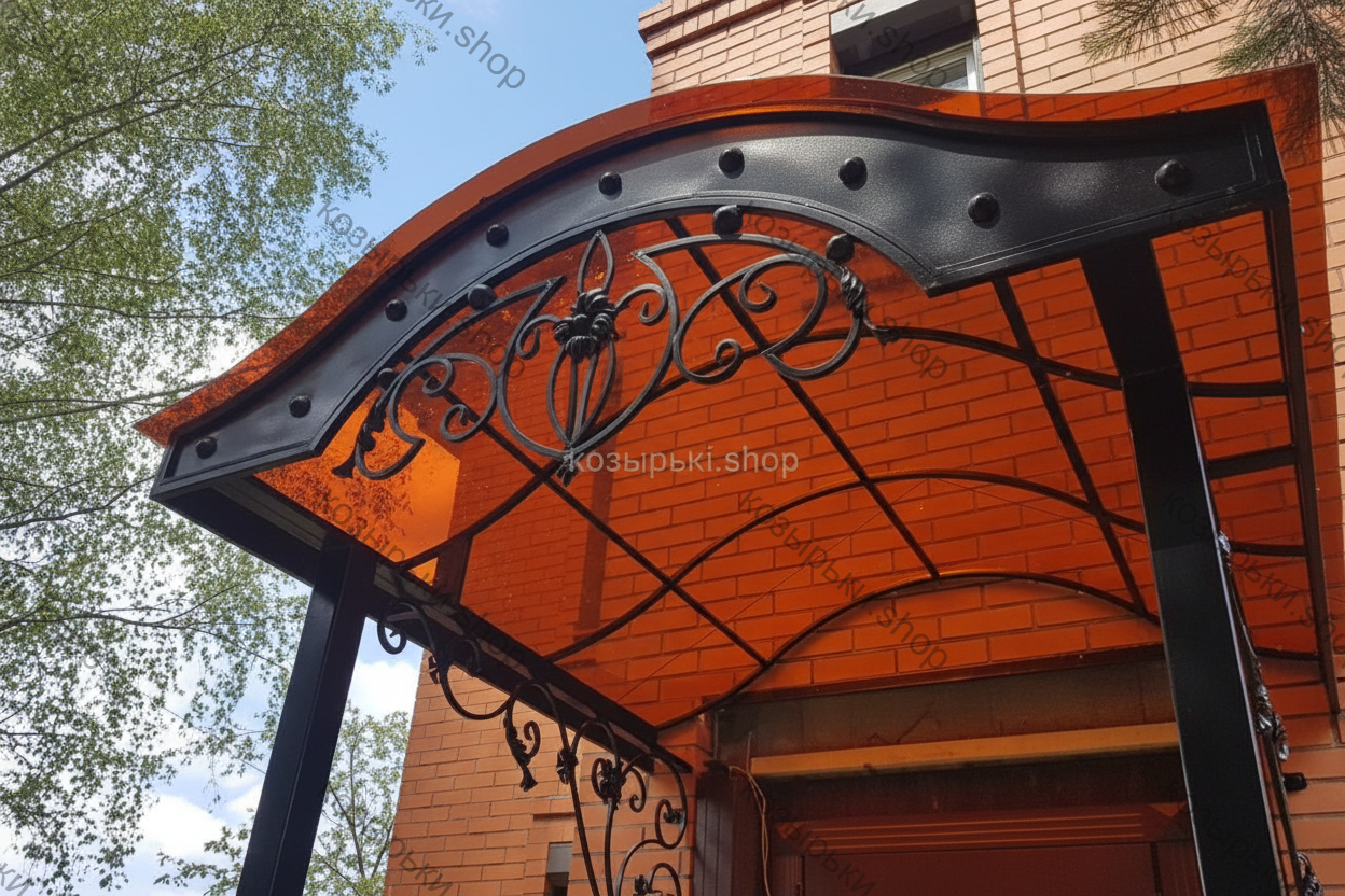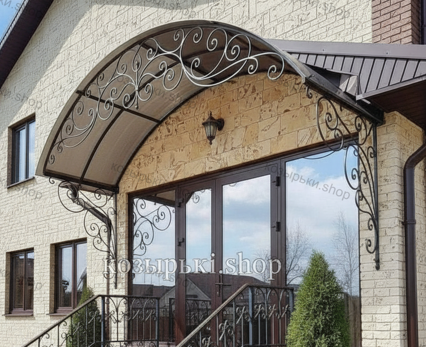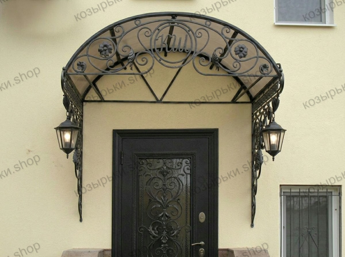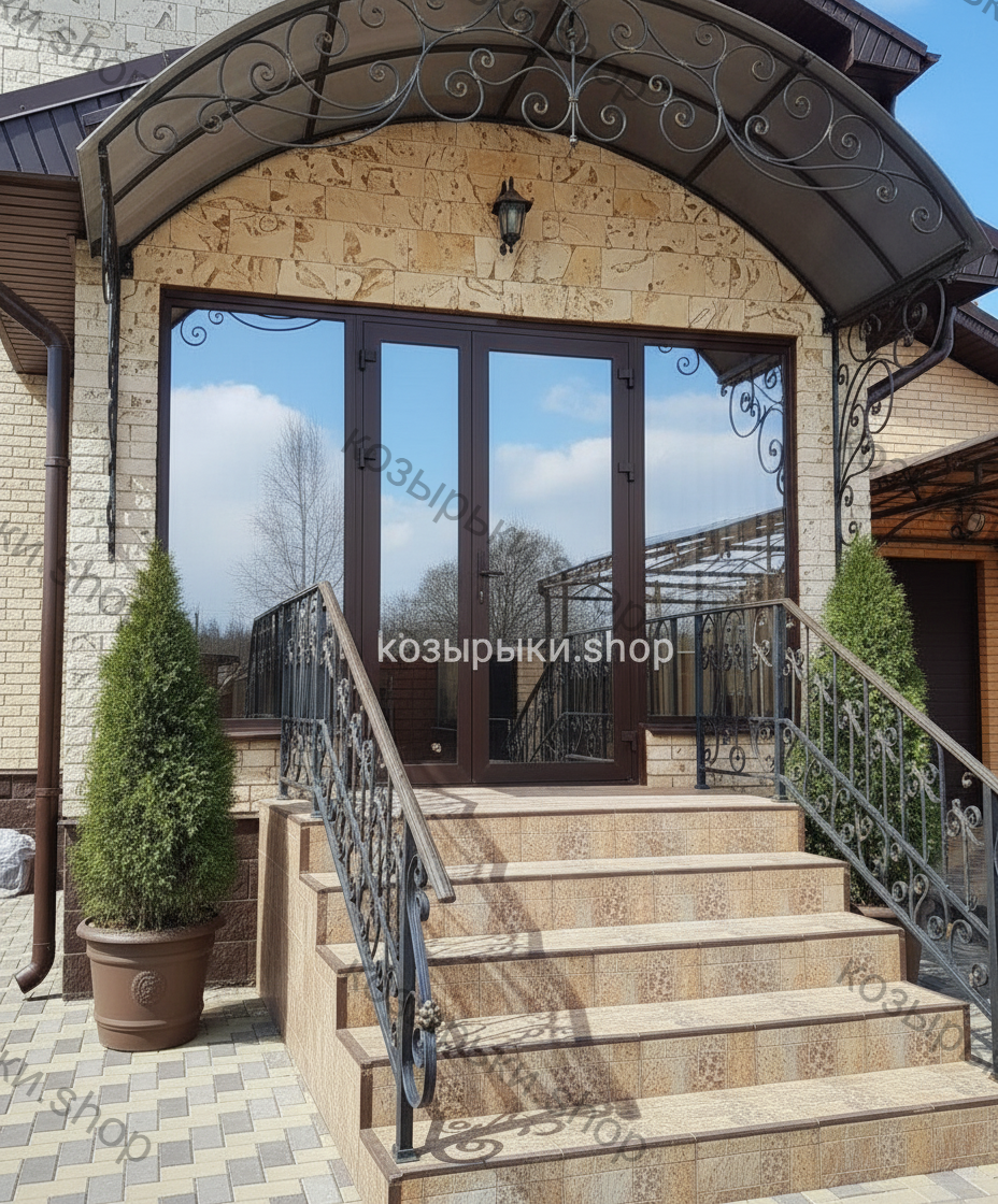 Кованый козырёк от козырьки.Shop — это не просто функциональный элемент защиты, а настоящее украшение фасада вашего дома, магазина или офиса. Почему стоит выбрать именно кованый козырёк? Козырёк надёжно укроет входную зону от дождя, снега и палящего солнца. Вы сможете спокойно открыть дверь, достать ключи или встретить гостей, не боясь непогоды. -Изделия изготавливаются из высококачественного металла с применением технологии художественной ковки. Специальная обработка (грунтовка и защитное покрытие) предотвращает коррозию и гарантирует многолетнюю службу конструкции. -Кованые узоры придают козырьку изысканный, благородный вид. Элегантные изгибы и орнаменты превращают обычный навес в произведение искусства, подчёркивая статус и индивидуальность владельца. -Козырёк гармонично сочетается с другими коваными элементами: перилами, лестницами, воротами, заборами. Он впишется в любой архитектурный стиль — от классики до модерна. -Мы предлагаем как готовые решения из каталога, так и изготовление козырька по персональному эскизу. Вы можете выбрать форму, размер и узор, которые идеально подойдут к вашему фасаду. Варианты исполнения: односкатные — лаконичные и практичные; арочные — изящные и популярные; волнообразные — с оригинальным изгибом; прямые — максимально устойчивые; шаровидные — эффектные «зонтики». Материалы на выбор: металлические листы (прочность и надёжность); монолитный или сотовый поликарбонат (лёгкость и светопропускание). Преимущества заказа у нас: профессиональный дизайн‑проект с учётом особенностей вашего здания; качественное изготовление с соблюдением всех технологических норм; аккуратная покраска в выбранный вами цвет; оперативная установка опытными мастерами. Преобразите входную зону с кованым козырьком от козырьки.Shop — сочетайте практичность с эстетикой, создавая неповторимый облик вашего здания!