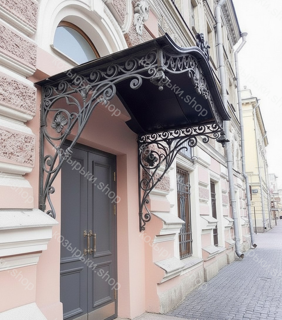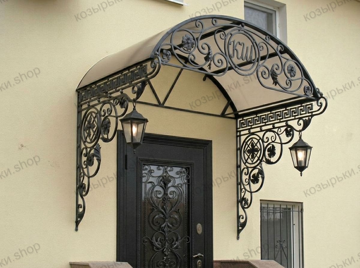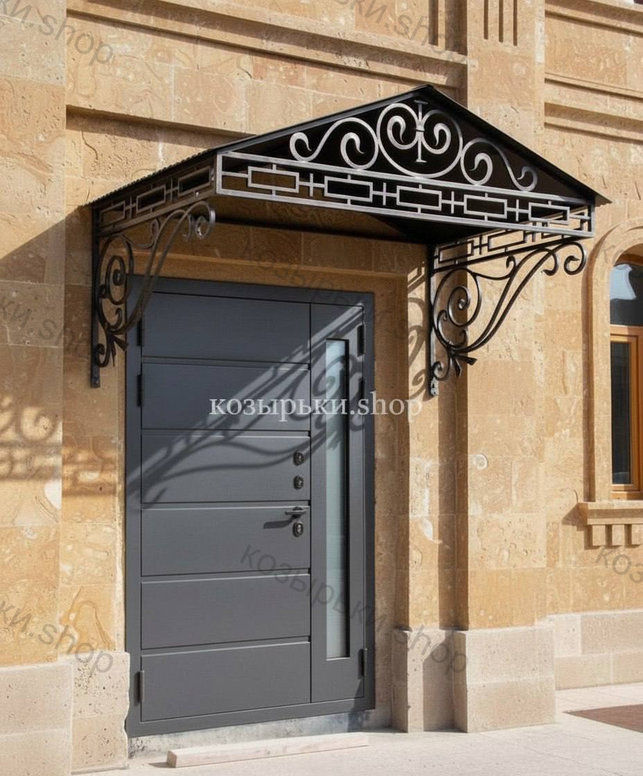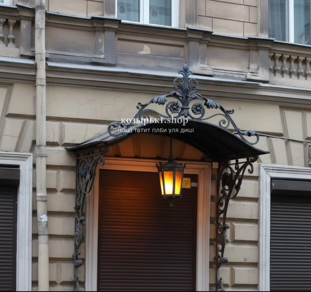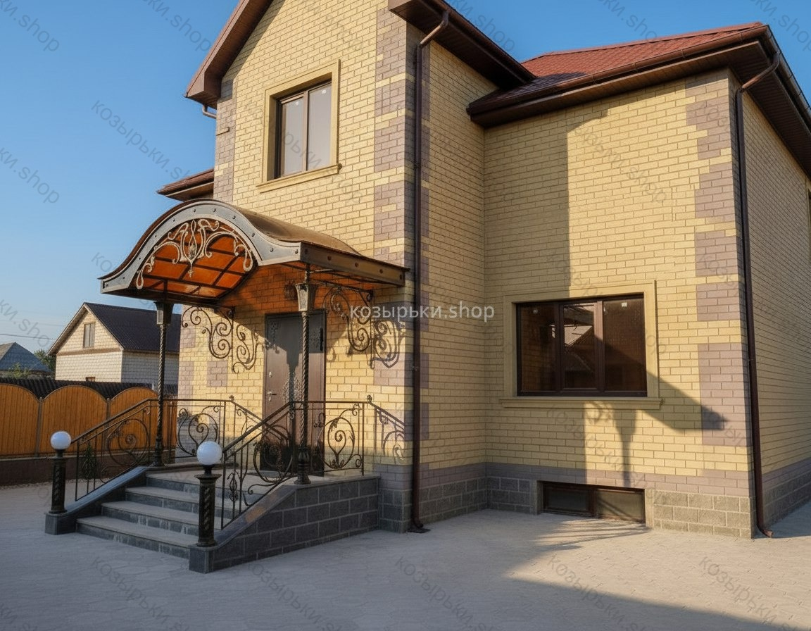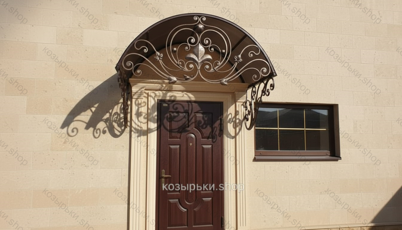 Кованый козырёк от козырьки.Shop — это не просто функциональный элемент защиты, а настоящее украшение фасада вашего дома, магазина или офиса. Почему стоит выбрать именно кованый козырёк? Козырёк надёжно укроет входную зону от дождя, снега и палящего солнца. Вы сможете спокойно открыть дверь, достать ключи или встретить гостей, не боясь непогоды. -Изделия изготавливаются из высококачественного металла с применением технологии художественной ковки. Специальная обработка (грунтовка и защитное покрытие) предотвращает коррозию и гарантирует многолетнюю службу конструкции. -Кованые узоры придают козырьку изысканный, благородный вид. Элегантные изгибы и орнаменты превращают обычный навес в произведение искусства, подчёркивая статус и индивидуальность владельца. -Козырёк гармонично сочетается с другими коваными элементами: перилами, лестницами, воротами, заборами. Он впишется в любой архитектурный стиль — от классики до модерна. -Мы предлагаем как готовые решения из каталога, так и изготовление козырька по персональному эскизу. Вы можете выбрать форму, размер и узор, которые идеально подойдут к вашему фасаду. Варианты исполнения: односкатные — лаконичные и практичные; арочные — изящные и популярные; волнообразные — с оригинальным изгибом; прямые — максимально устойчивые; шаровидные — эффектные «зонтики». Материалы на выбор: металлические листы (прочность и надёжность); монолитный или сотовый поликарбонат (лёгкость и светопропускание). Преимущества заказа у нас: профессиональный дизайн‑проект с учётом особенностей вашего здания; качественное изготовление с соблюдением всех технологических норм; аккуратная покраска в выбранный вами цвет; оперативная установка опытными мастерами. Преобразите входную зону с кованым козырьком от козырьки.Shop — сочетайте практичность с эстетикой, создавая неповторимый облик вашего здания!