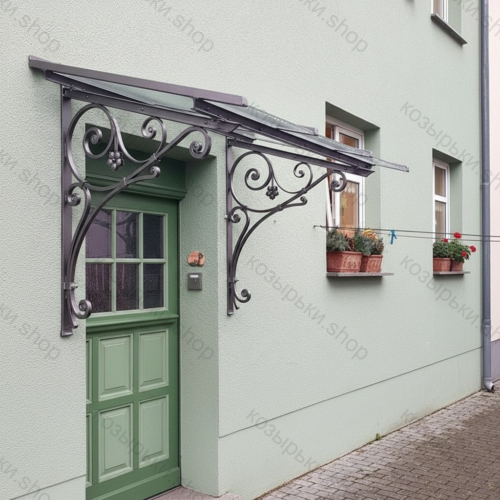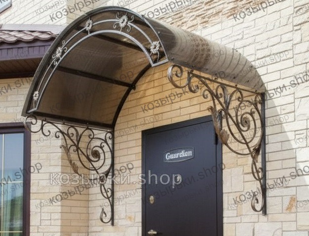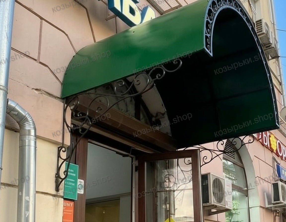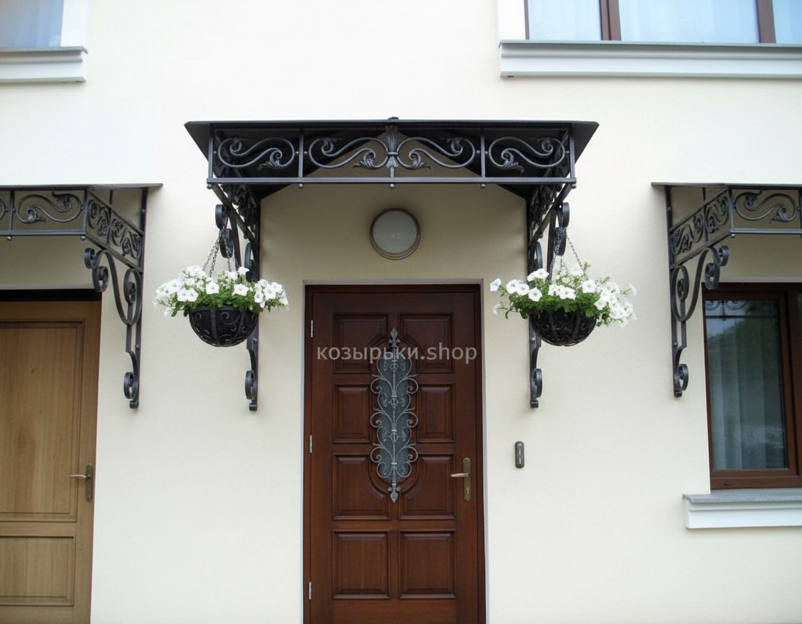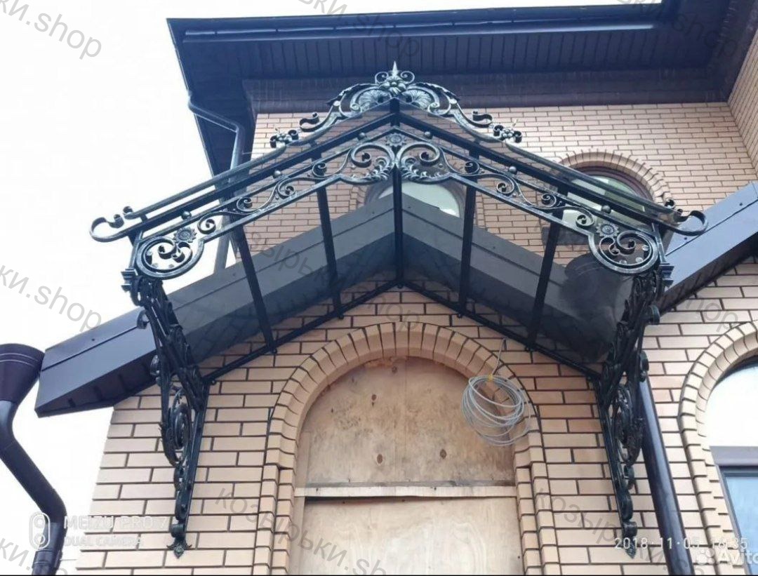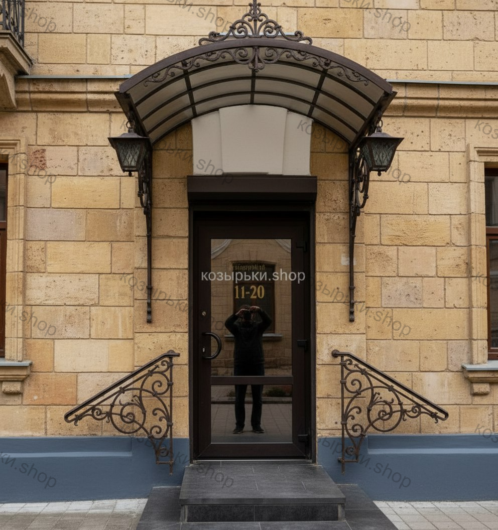 Кованый козырёк от козырьки.Shop — это не просто функциональный элемент защиты, а настоящее украшение фасада вашего дома, магазина или офиса. Почему стоит выбрать именно кованый козырёк? Козырёк надёжно укроет входную зону от дождя, снега и палящего солнца. Вы сможете спокойно открыть дверь, достать ключи или встретить гостей, не боясь непогоды. -Изделия изготавливаются из высококачественного металла с применением технологии художественной ковки. Специальная обработка (грунтовка и защитное покрытие) предотвращает коррозию и гарантирует многолетнюю службу конструкции. -Кованые узоры придают козырьку изысканный, благородный вид. Элегантные изгибы и орнаменты превращают обычный навес в произведение искусства, подчёркивая статус и индивидуальность владельца. -Козырёк гармонично сочетается с другими коваными элементами: перилами, лестницами, воротами, заборами. Он впишется в любой архитектурный стиль — от классики до модерна. -Мы предлагаем как готовые решения из каталога, так и изготовление козырька по персональному эскизу. Вы можете выбрать форму, размер и узор, которые идеально подойдут к вашему фасаду. Варианты исполнения: односкатные — лаконичные и практичные; арочные — изящные и популярные; волнообразные — с оригинальным изгибом; прямые — максимально устойчивые; шаровидные — эффектные «зонтики». Материалы на выбор: металлические листы (прочность и надёжность); монолитный или сотовый поликарбонат (лёгкость и светопропускание). Преимущества заказа у нас: профессиональный дизайн‑проект с учётом особенностей вашего здания; качественное изготовление с соблюдением всех технологических норм; аккуратная покраска в выбранный вами цвет; оперативная установка опытными мастерами. Преобразите входную зону с кованым козырьком от козырьки.Shop — сочетайте практичность с эстетикой, создавая неповторимый облик вашего здания!