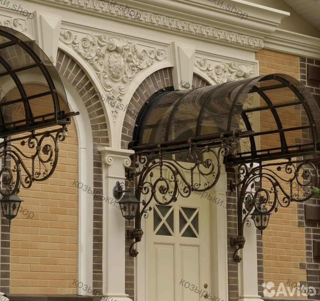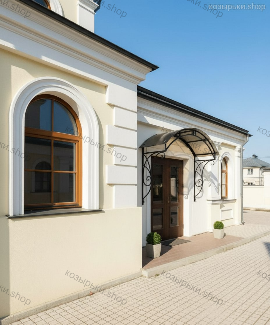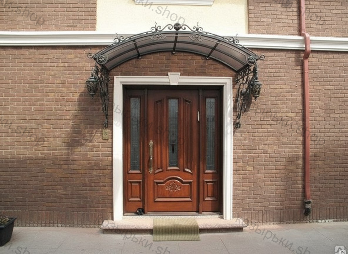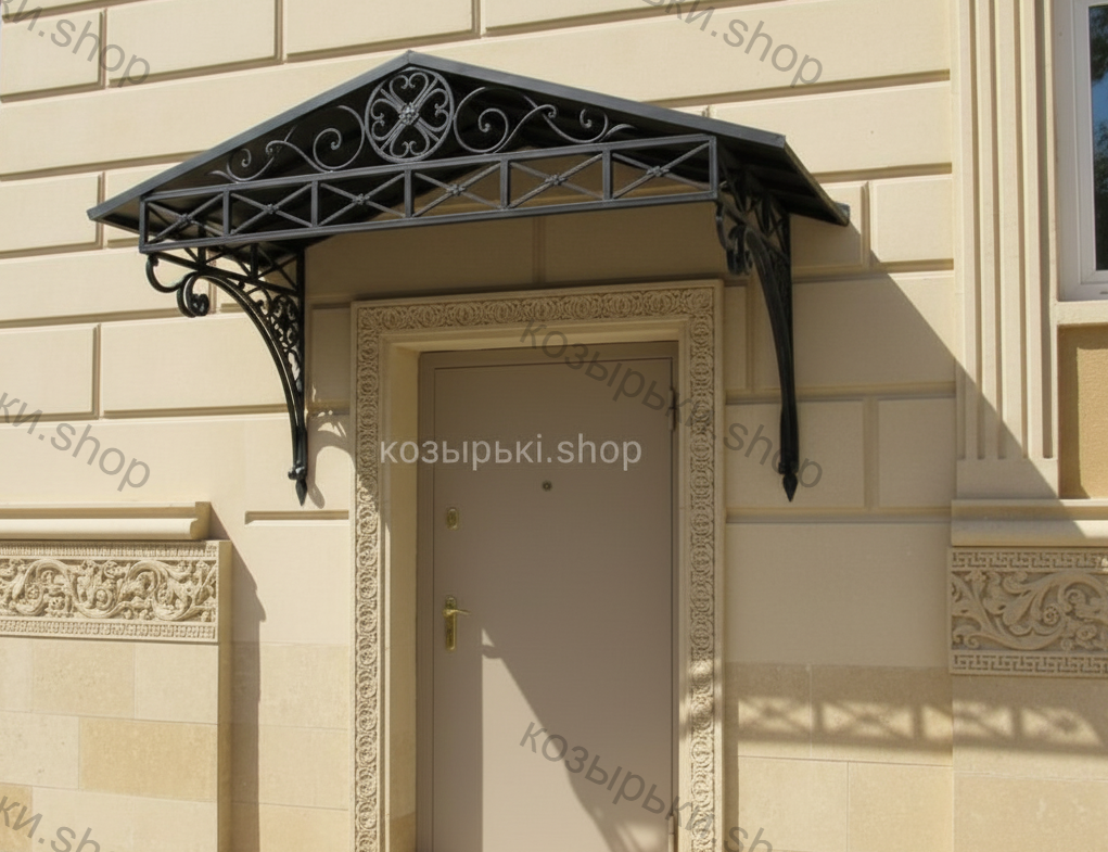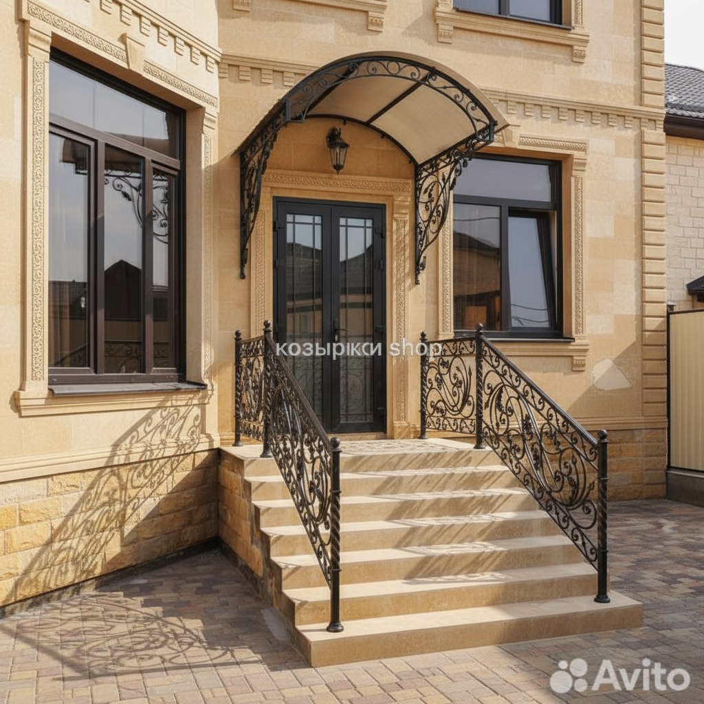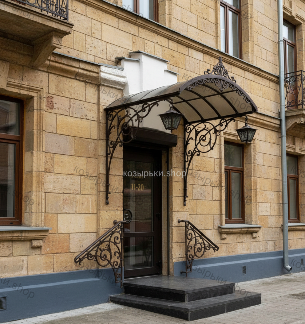 Кованый козырёк от козырьки.Shop — это не просто функциональный элемент защиты, а настоящее украшение фасада вашего дома, магазина или офиса. Почему стоит выбрать именно кованый козырёк? Козырёк надёжно укроет входную зону от дождя, снега и палящего солнца. Вы сможете спокойно открыть дверь, достать ключи или встретить гостей, не боясь непогоды. -Изделия изготавливаются из высококачественного металла с применением технологии художественной ковки. Специальная обработка (грунтовка и защитное покрытие) предотвращает коррозию и гарантирует многолетнюю службу конструкции. -Кованые узоры придают козырьку изысканный, благородный вид. Элегантные изгибы и орнаменты превращают обычный навес в произведение искусства, подчёркивая статус и индивидуальность владельца. -Козырёк гармонично сочетается с другими коваными элементами: перилами, лестницами, воротами, заборами. Он впишется в любой архитектурный стиль — от классики до модерна. -Мы предлагаем как готовые решения из каталога, так и изготовление козырька по персональному эскизу. Вы можете выбрать форму, размер и узор, которые идеально подойдут к вашему фасаду. Варианты исполнения: односкатные — лаконичные и практичные; арочные — изящные и популярные; волнообразные — с оригинальным изгибом; прямые — максимально устойчивые; шаровидные — эффектные «зонтики». Материалы на выбор: металлические листы (прочность и надёжность); монолитный или сотовый поликарбонат (лёгкость и светопропускание). Преимущества заказа у нас: профессиональный дизайн‑проект с учётом особенностей вашего здания; качественное изготовление с соблюдением всех технологических норм; аккуратная покраска в выбранный вами цвет; оперативная установка опытными мастерами. Преобразите входную зону с кованым козырьком от козырьки.Shop — сочетайте практичность с эстетикой, создавая неповторимый облик вашего здания!