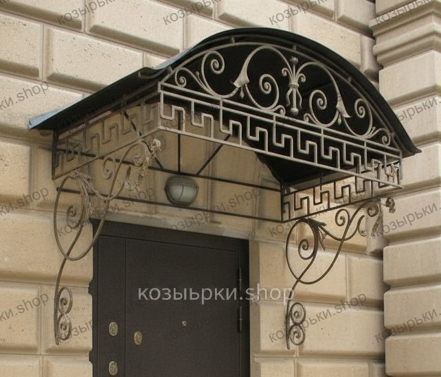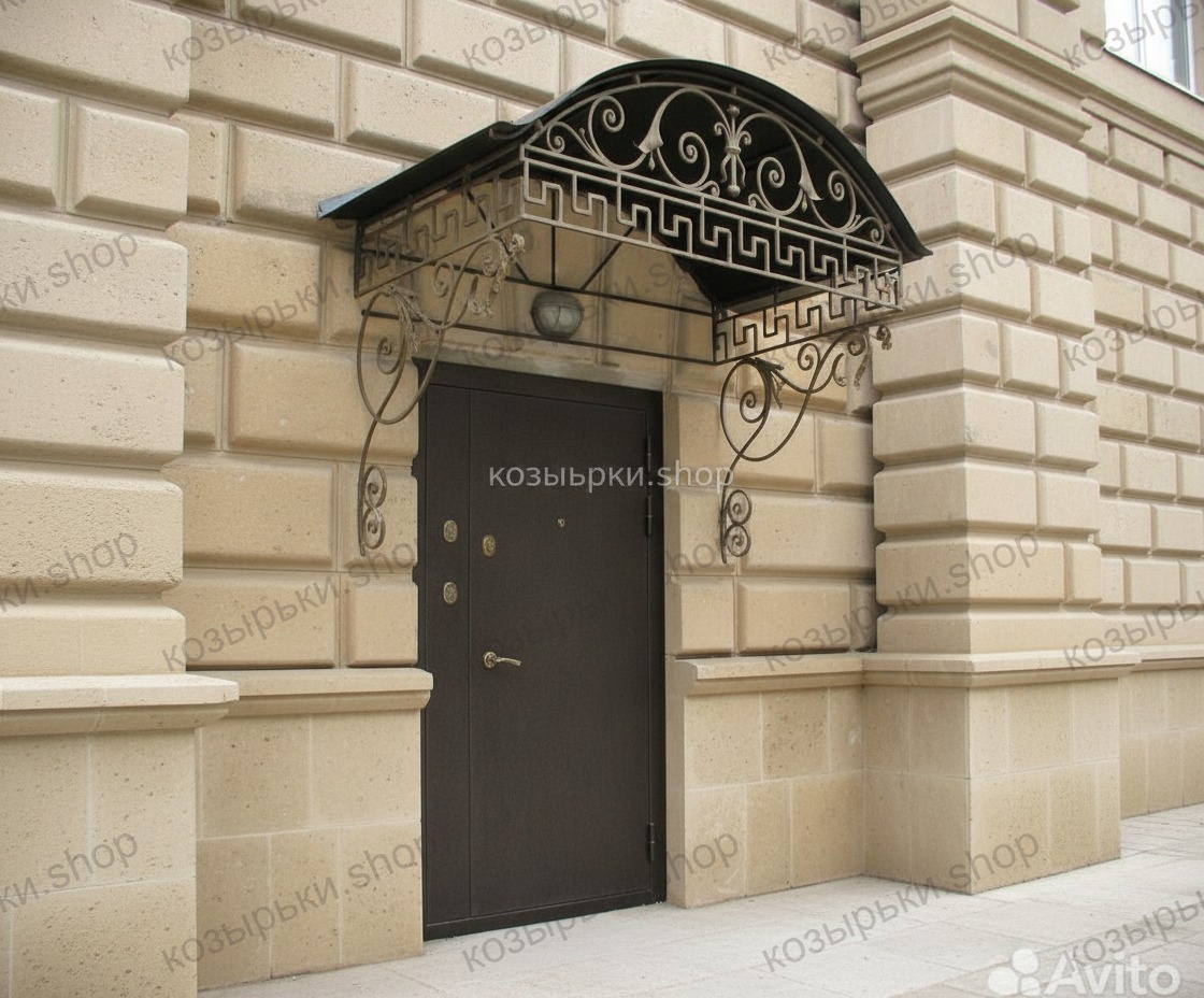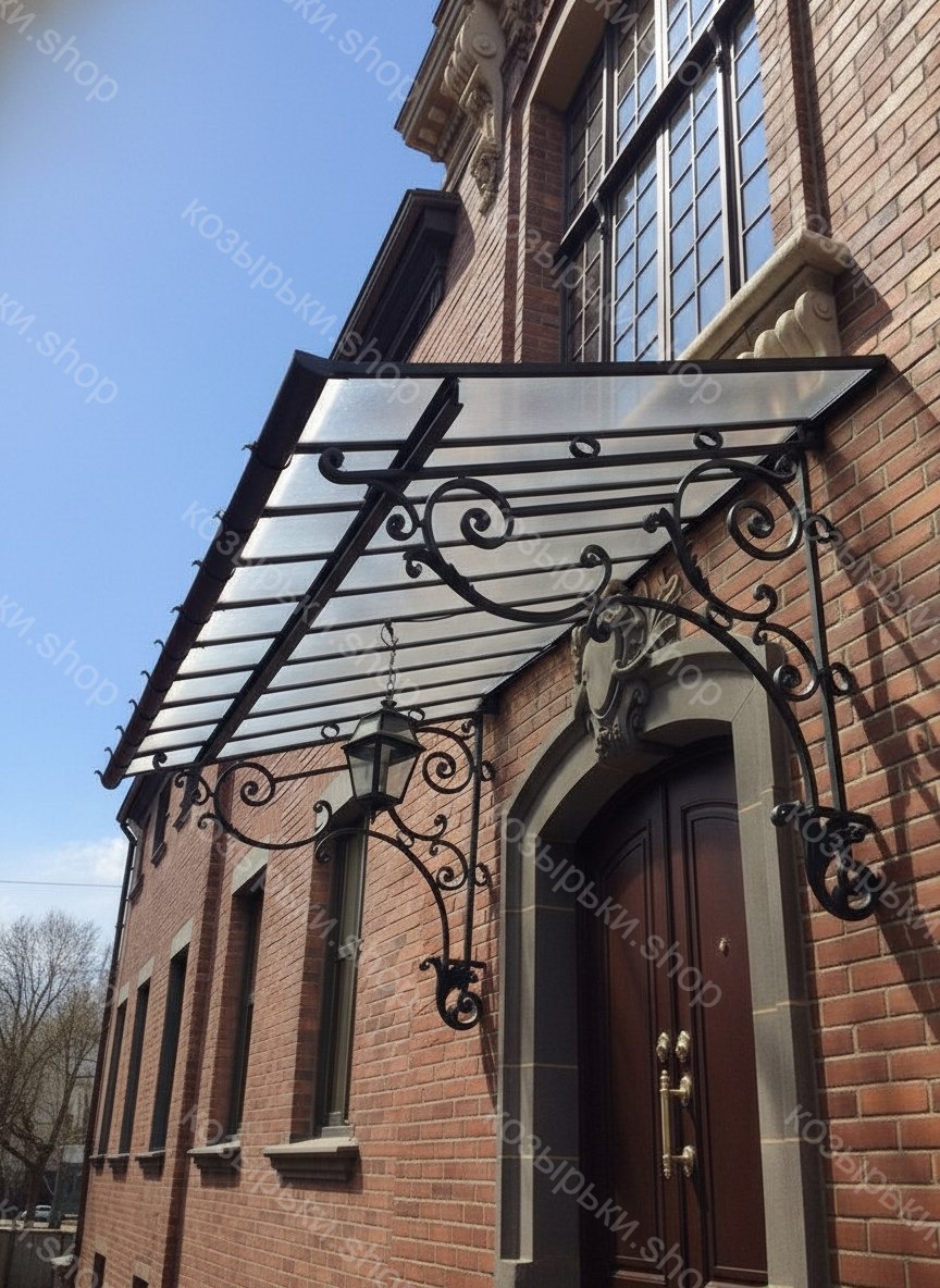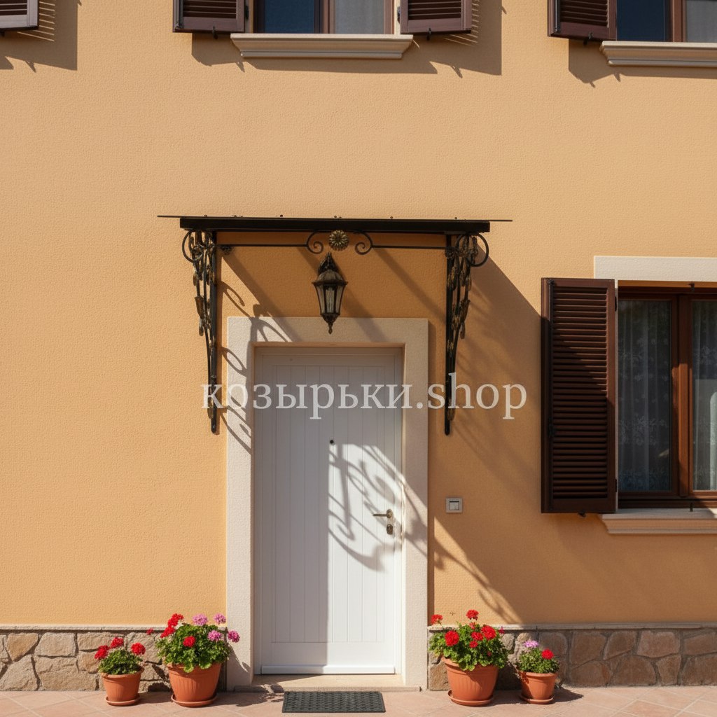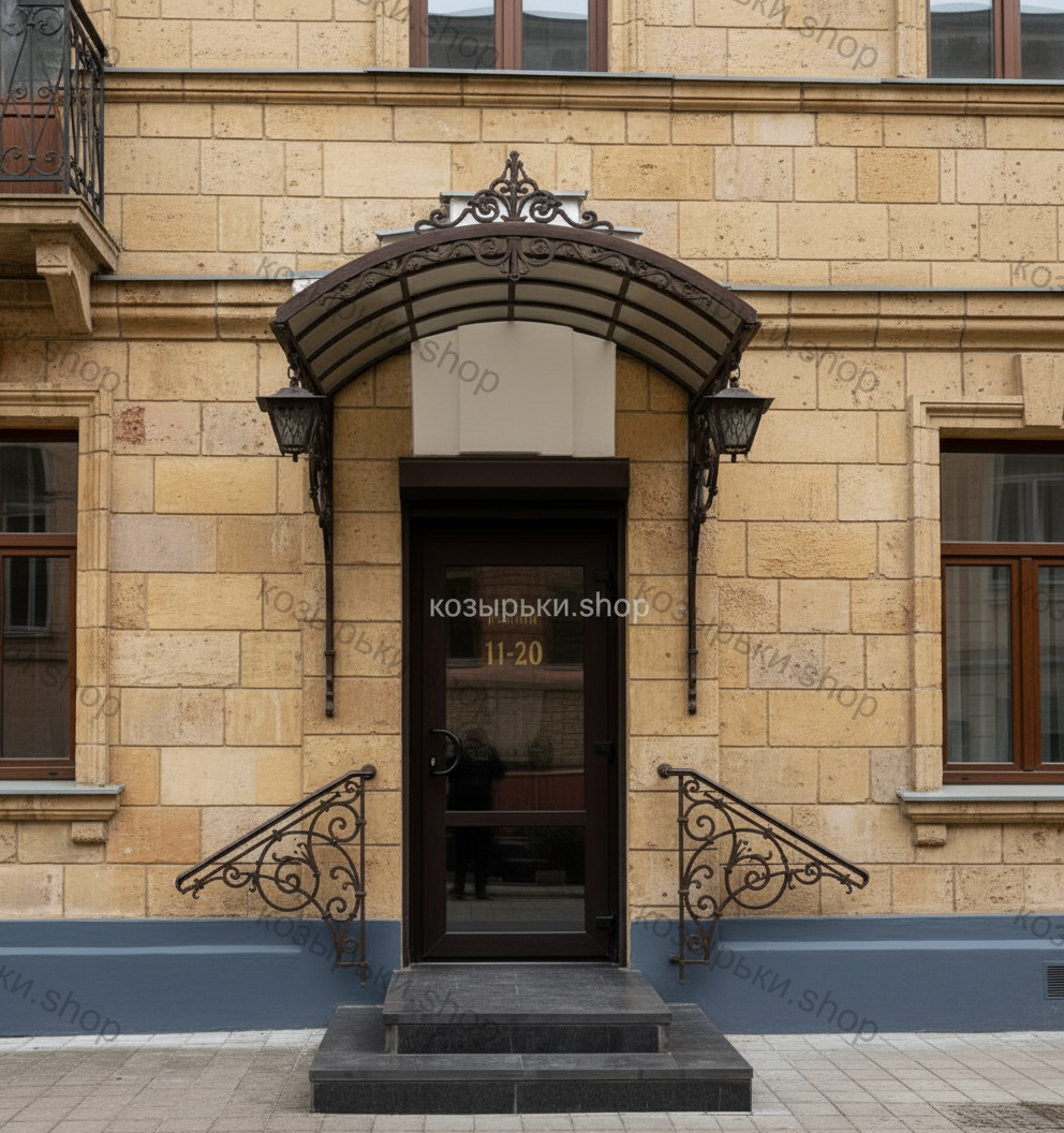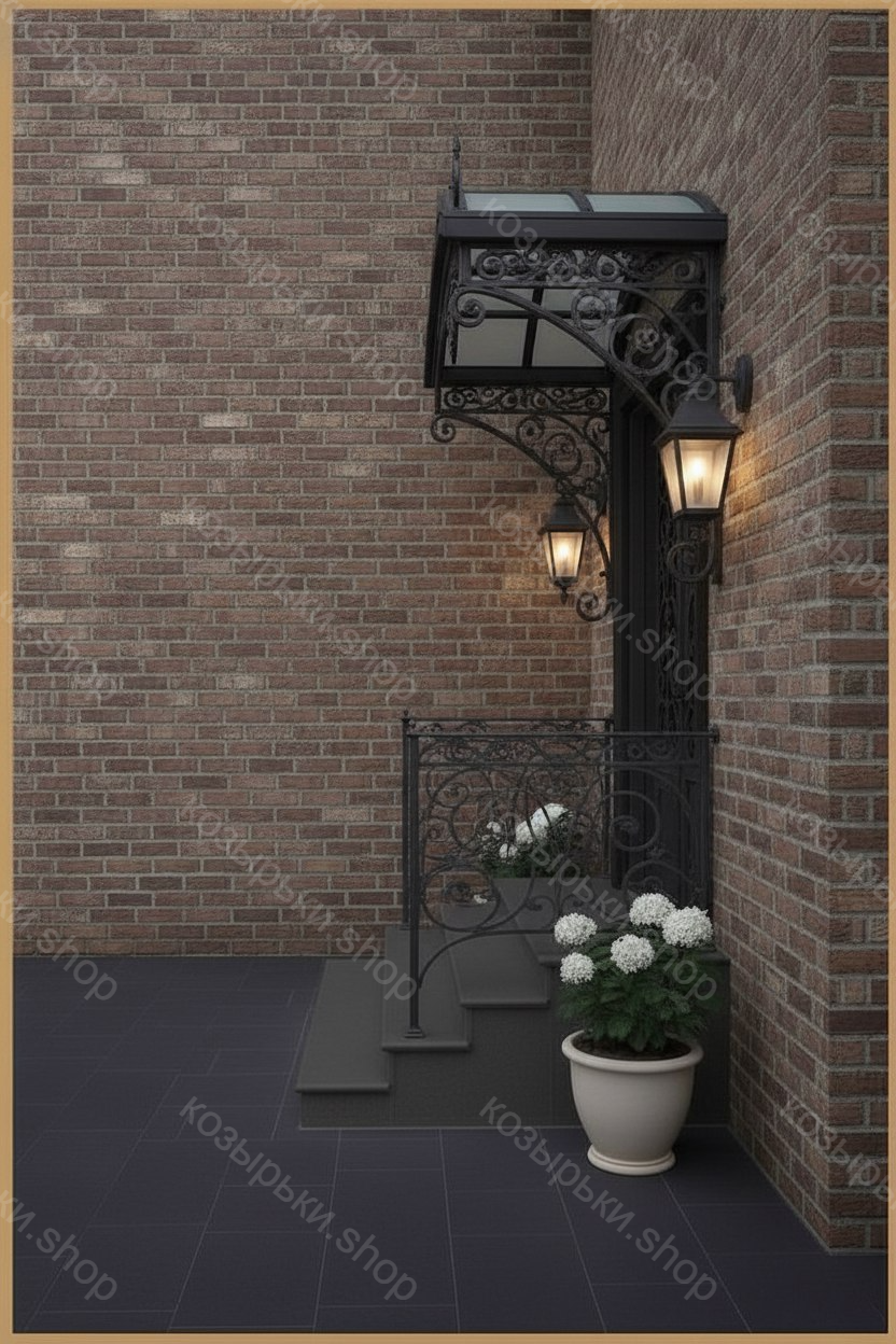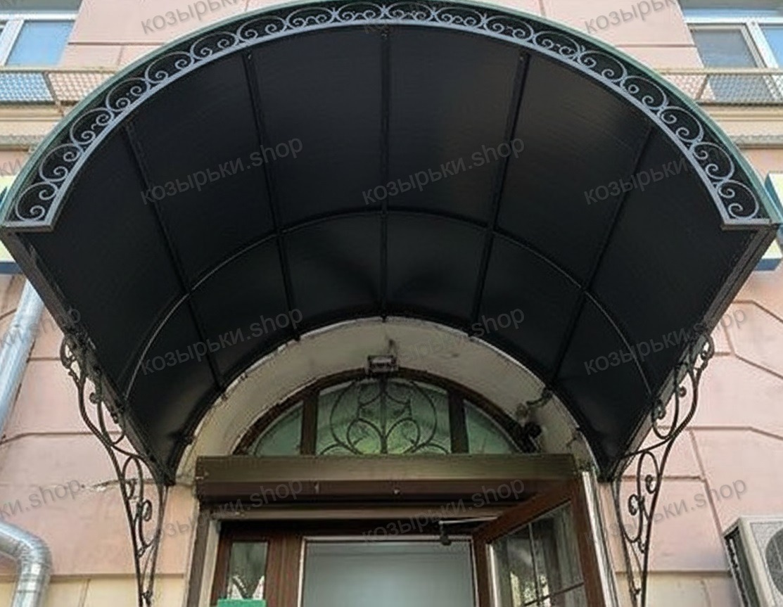 Кованый козырёк от козырьки.Shop — это не просто функциональный элемент защиты, а настоящее украшение фасада вашего дома, магазина или офиса. Почему стоит выбрать именно кованый козырёк? Козырёк надёжно укроет входную зону от дождя, снега и палящего солнца. Вы сможете спокойно открыть дверь, достать ключи или встретить гостей, не боясь непогоды. -Изделия изготавливаются из высококачественного металла с применением технологии художественной ковки. Специальная обработка (грунтовка и защитное покрытие) предотвращает коррозию и гарантирует многолетнюю службу конструкции. -Кованые узоры придают козырьку изысканный, благородный вид. Элегантные изгибы и орнаменты превращают обычный навес в произведение искусства, подчёркивая статус и индивидуальность владельца. -Козырёк гармонично сочетается с другими коваными элементами: перилами, лестницами, воротами, заборами. Он впишется в любой архитектурный стиль — от классики до модерна. -Мы предлагаем как готовые решения из каталога, так и изготовление козырька по персональному эскизу. Вы можете выбрать форму, размер и узор, которые идеально подойдут к вашему фасаду. Варианты исполнения: односкатные — лаконичные и практичные; арочные — изящные и популярные; волнообразные — с оригинальным изгибом; прямые — максимально устойчивые; шаровидные — эффектные «зонтики». Материалы на выбор: металлические листы (прочность и надёжность); монолитный или сотовый поликарбонат (лёгкость и светопропускание). Преимущества заказа у нас: профессиональный дизайн‑проект с учётом особенностей вашего здания; качественное изготовление с соблюдением всех технологических норм; аккуратная покраска в выбранный вами цвет; оперативная установка опытными мастерами. Преобразите входную зону с кованым козырьком от козырьки.Shop — сочетайте практичность с эстетикой, создавая неповторимый облик вашего здания!